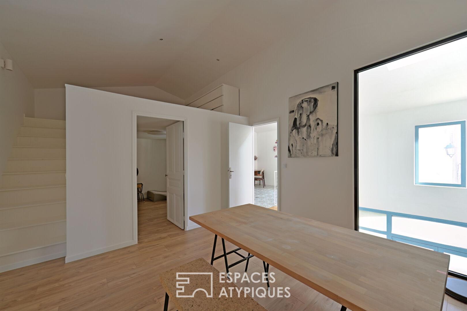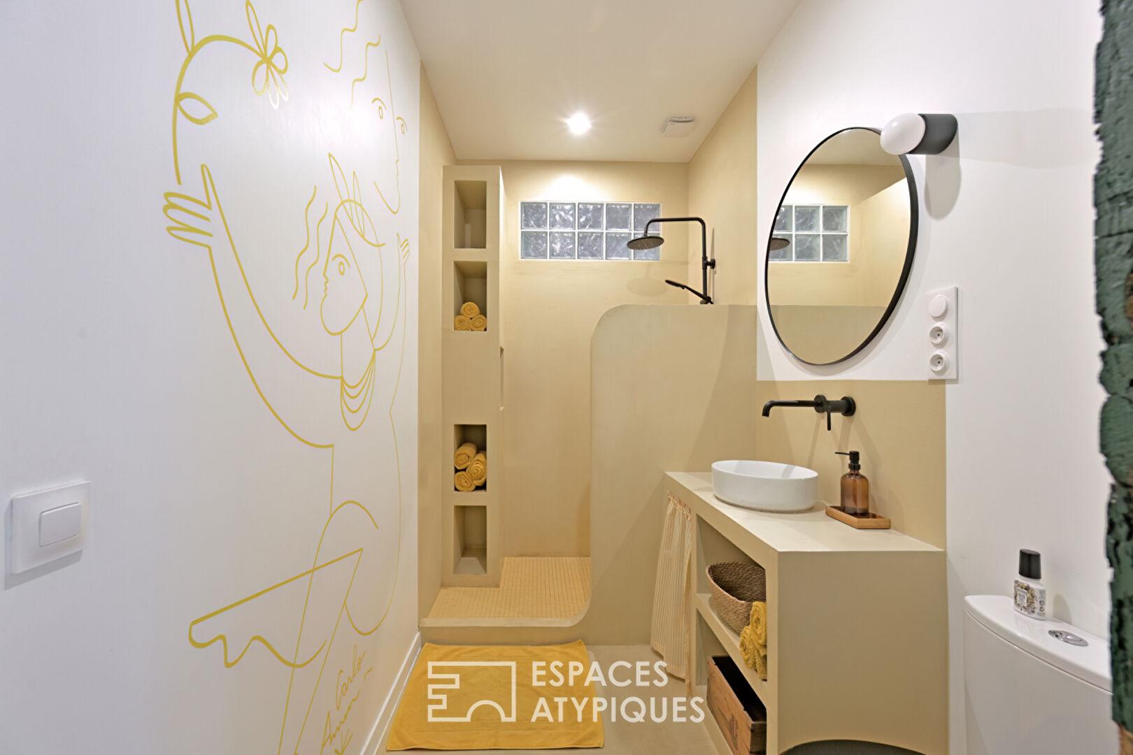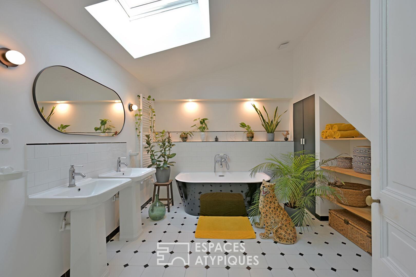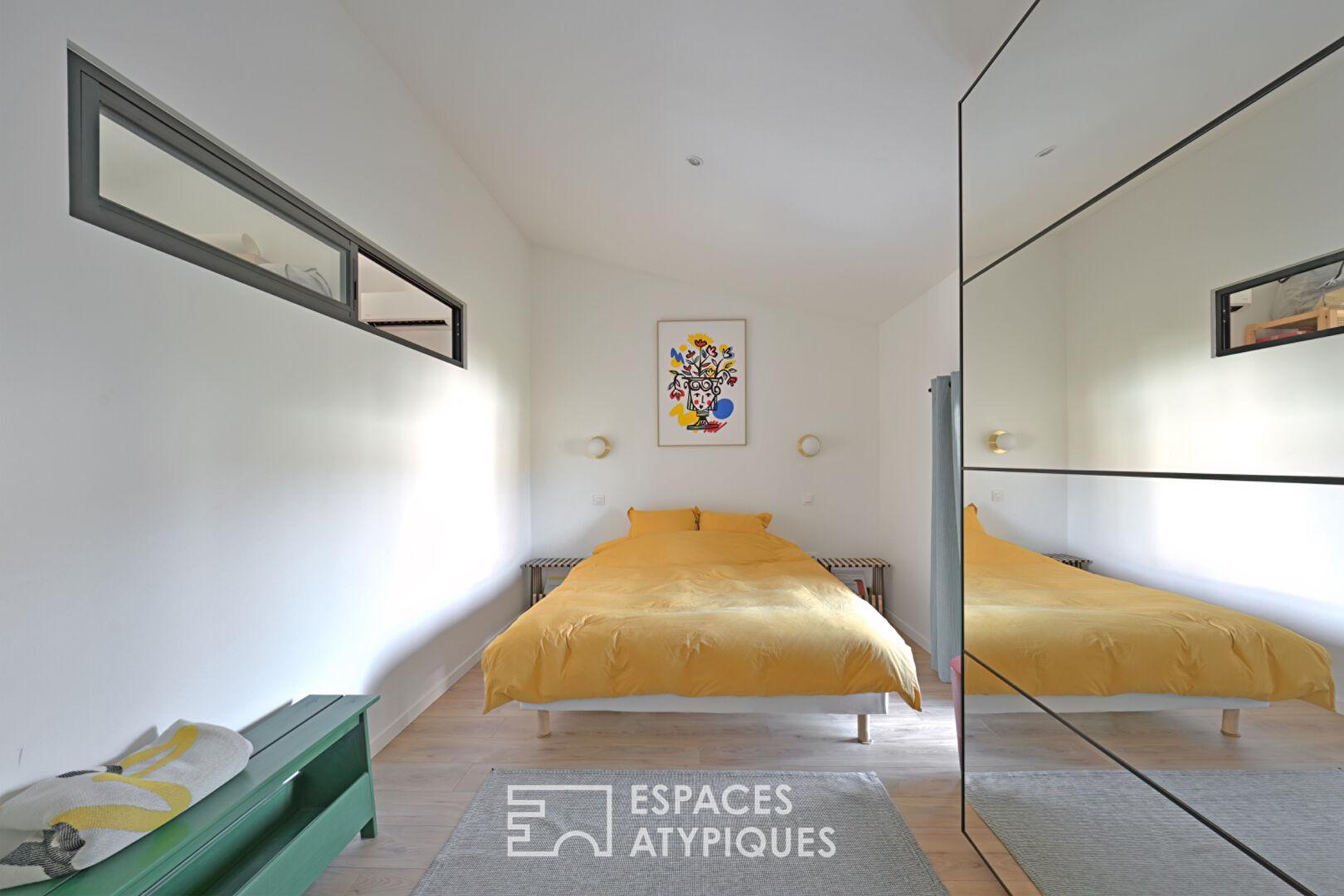 The staircase leading to the upper floor cleverly conceals all the home’s audio technology beneath its discreet storage. Upstairs, the mezzanine, clad in cement tiles, provides access to several spaces: an office ideal for a home cinema, a bright bedroom with storage overlooking the garden, a spacious retro-style bathroom with a freestanding bathtub and checkerboard flooring, and a playroom/children’s bedroom that could easily be converted into a dressing room as needed.
