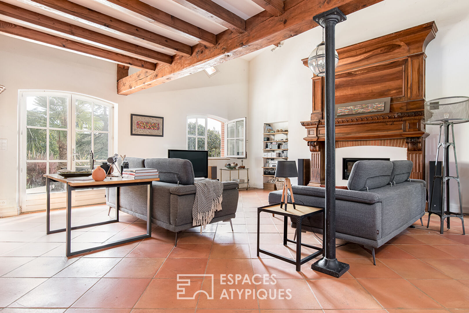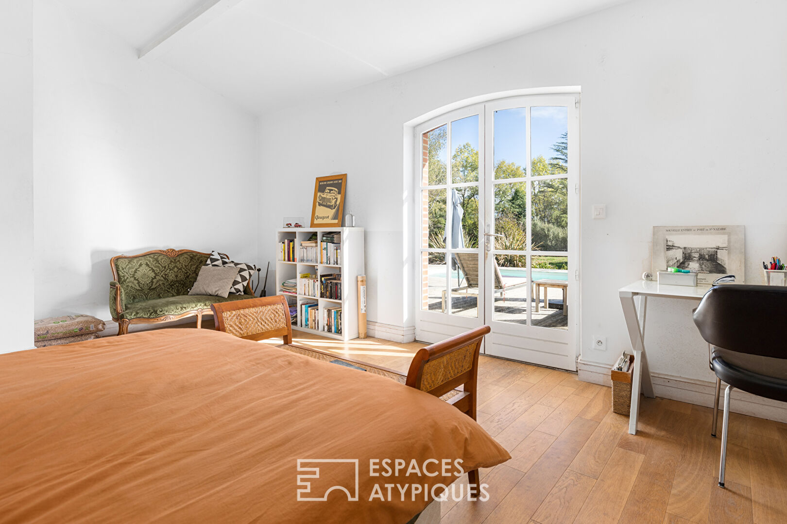 This beautiful country house has more than 290sqm of living space, in a bucolic setting, just outside the village. Presented as a real alternative to enjoy a serene living environment surrounded by greenery, it benefits from all amenities and transport less than 3 minutes away. The property ingeniously mixes old and new and blends into lush vegetation, benefiting from more than 8000sqm of land on the edge of a stream. The recent part integrates fluidly with the old by offering a very beautiful living space and its majestic insert fireplace, the centerpiece of the home. A large family kitchen opening onto a first terrace area, on the north side, and a parental area with shower room, on one level, opening onto the swimming pool on the south side, complete the most recent part. The old part houses a dovecote and offers a space including 3 bedrooms, 2 of which are on the ground floor, with generous volumes, an office and 2 bathrooms. A secondary entrance redesigned into a winter garden as well as a large mezzanine overlooking the living room allow everyone to occupy the premises and create complementary spaces with personalized atmospheres. The exteriors have been elegantly redesigned with the integration of a travertine terrace area and the creation of a swimming pool on the south side, giving way to a garden planted with multiple species, to the delight of children and pets. The sound of the stream at the end of the property brings charm and tranquility. An independent outbuilding of 60m2, in brick and pebble, has been converted into a workshop and garage. This rare property in the town of Lherm, in a preserved environment and not overlooked, is located near nursery and primary schools. Shops 3 minutes away and Toulouse city center 35 minutes away. Favorite for: – the unique environment at the foot of the village – the proximity to transport – the space and charm of the property