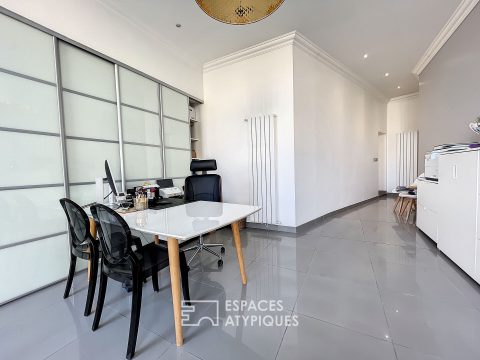 Its private entrance opens onto a bright reception hall. Continuing on, a corridor leads us to two offices with storage space. A kitchenette with WC and shower complete the advantages of this atypical room.