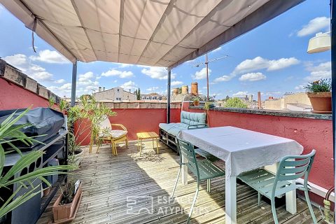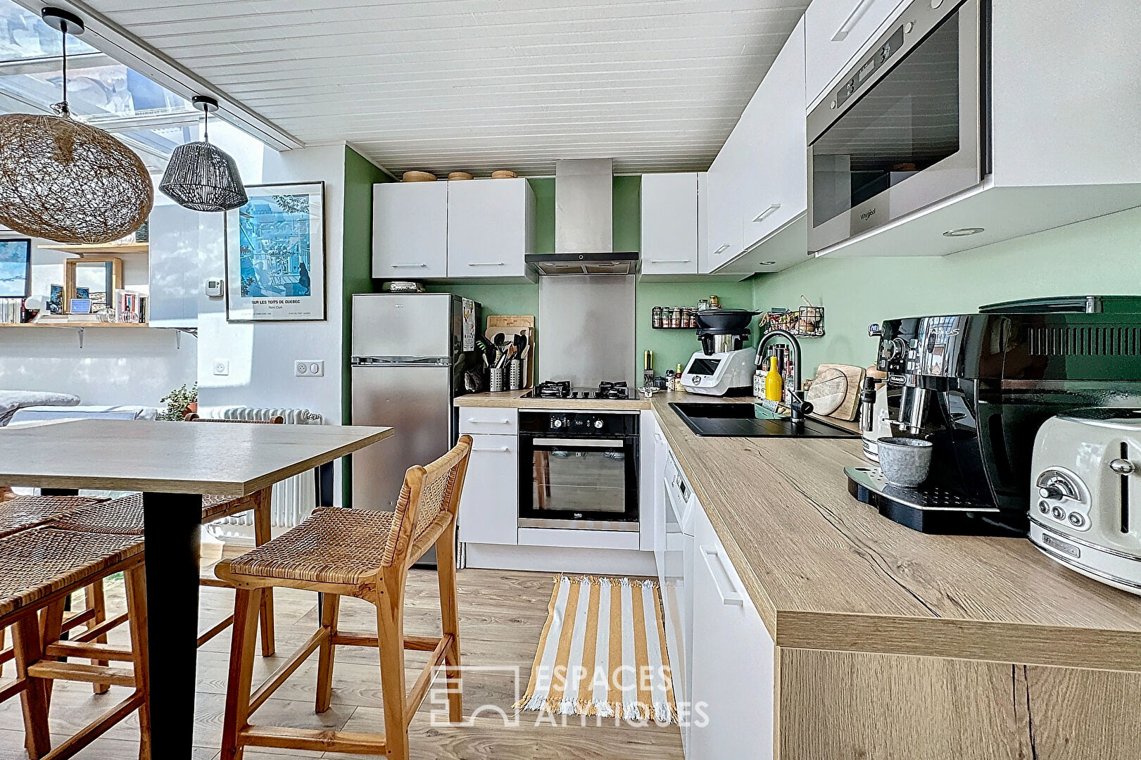 The entrance is on the 2nd floor, with a private staircase leading to the 3rd floor. A landing leads to a living room with a fully equipped open kitchen. The living room, bathed in light thanks to a skylight and large bay windows, opens onto a beautiful 12m2 terrace facing due west. A corridor leads to the bathroom and the bedroom with plenty of storage space.