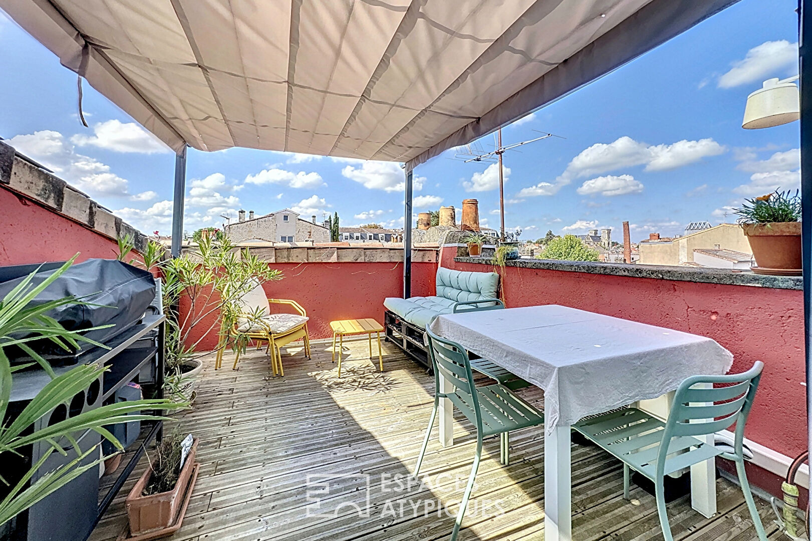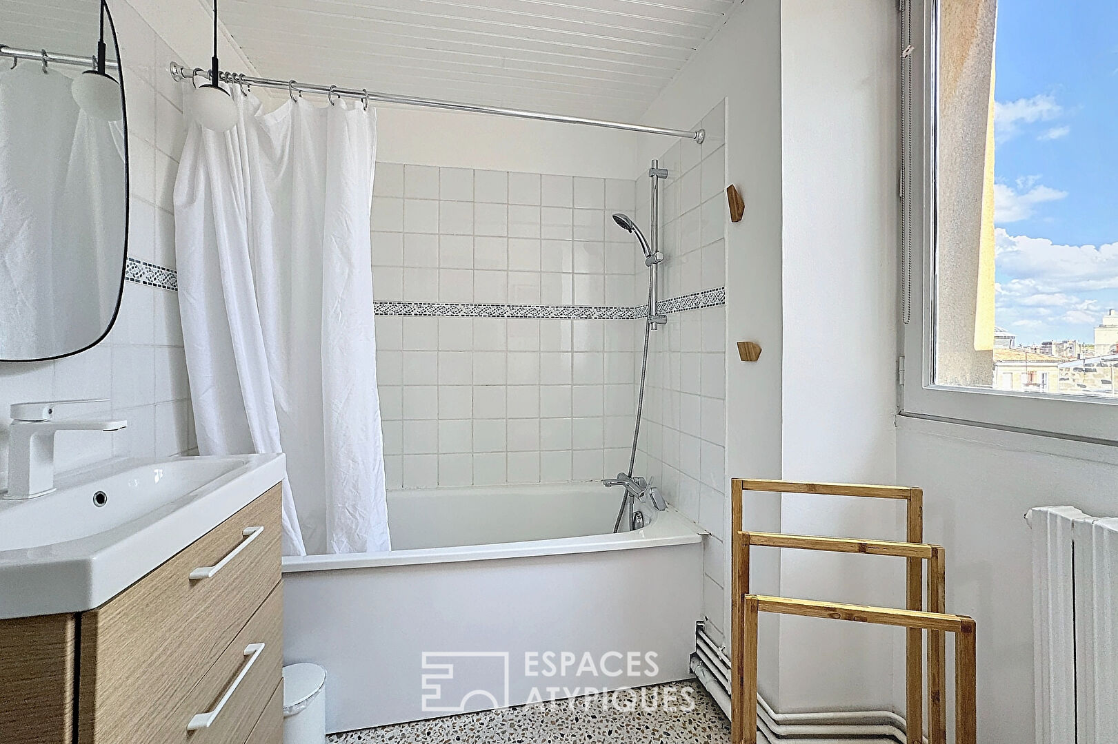 A stone’s throw from the Lerme market, nestled on the 3rd and top floor of a small condominium, this 38m2 apartment and its terrace offer a 360° view of the rooftops of Bordeaux.