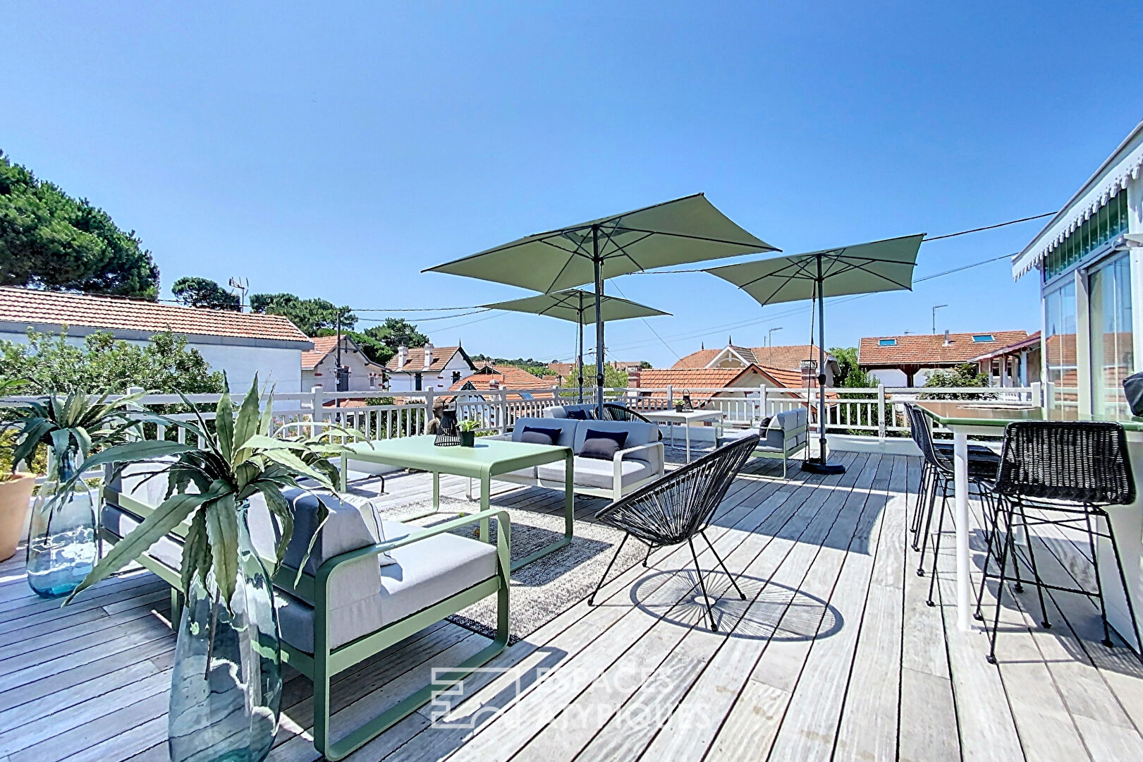Located a stone’s throw from the city center of Arcachon, close to the beach and shops, this magnificent 180m2 duplex can be experienced like a house. The absolute calm of this two-lot co-ownership and the panoramic view offered by a 58m2 terrace make this apartment an exceptional place to live. On the ground floor, a large entrance leads to a bedroom with private bathroom and a WC. A hallway leads to a gym and a wine cellar. In the extension, a double garage of 46m2. A private elevator leads upstairs where there is a magnificent living room bathed in light, opening onto a south-facing terrace. In the extension, a beautiful office space, an open, fitted and equipped kitchen, and a dining room area. Two bedrooms, with private bathrooms and a 10m2 dressing room complete the comfort of this property. This apartment with high-end finishes, and unique characteristics in the sector, is a rare
