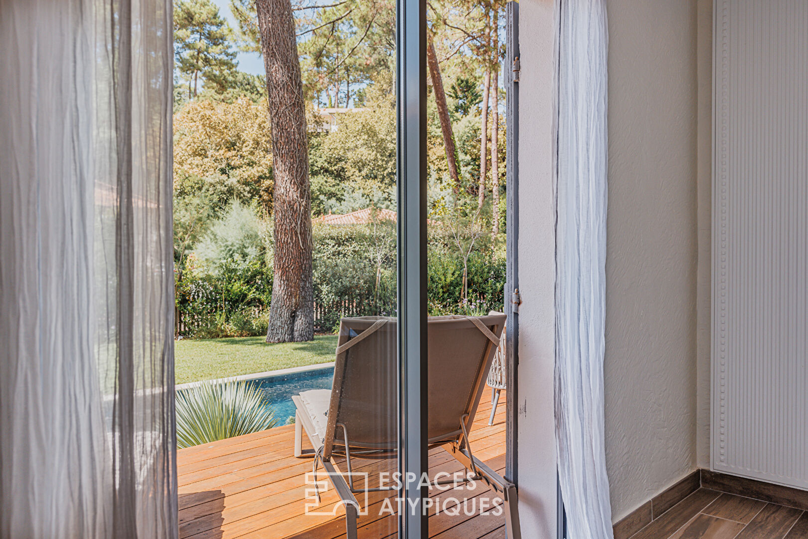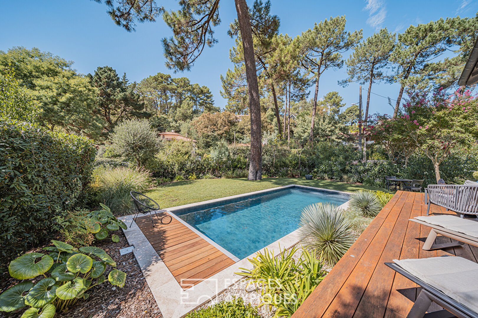 Located in the popular Abatilles district, this Gaume house of approximately 140m2 is enhanced by a characterful renovation in the middle of the pines. From the entrance, a spacious living room of approximately 40sqm, furnished with custom-made furniture and equipped with a wood stove. The whole opens onto a beautiful terrace where you can enjoy this calm and unobstructed environment overlooking a heated and secure swimming pool. On the night side, the master bedroom of 18 sqm has built-in cupboards and two large windows, bringing beautiful light to the room. A second bedroom of 13 sqm is just as comfortable. Continuing on, a guest area has a bright living room, a kitchen, a bedroom, a bathroom and a toilet. This property with undeniable charm is the opportunity to take full advantage of an area where nature and calm predominate while being close to the golf course and the most beautiful beaches of Arcachon.