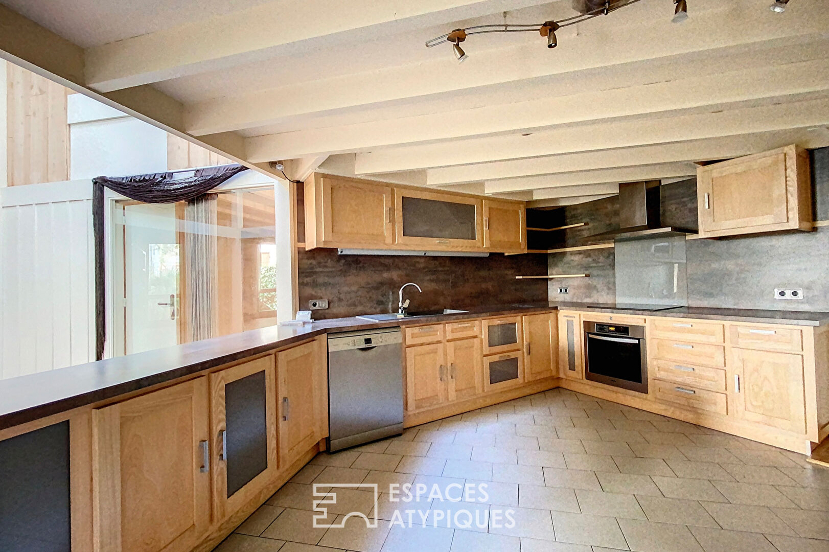 After crossing an entrance hall in which we discover a pretty period glass roof and the outdoor terrace, we arrive in the vast main room with a high ceiling. We discover an open kitchen with its large pantry and a bedroom with bathroom on the second day. A staircase provides access to the completely open floor which is organized into a large master suite with bathroom and an office space.