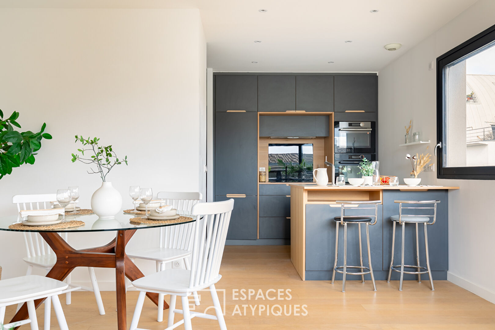 The entrance to the apartment is on the first floor of the building. A reception area with built-in storage and a private staircase lead to the second and top floor. The living room, bathed in light thanks to large south-facing openings, offers a clear view of the rooftops of Bordeaux, without vis-à-vis.
