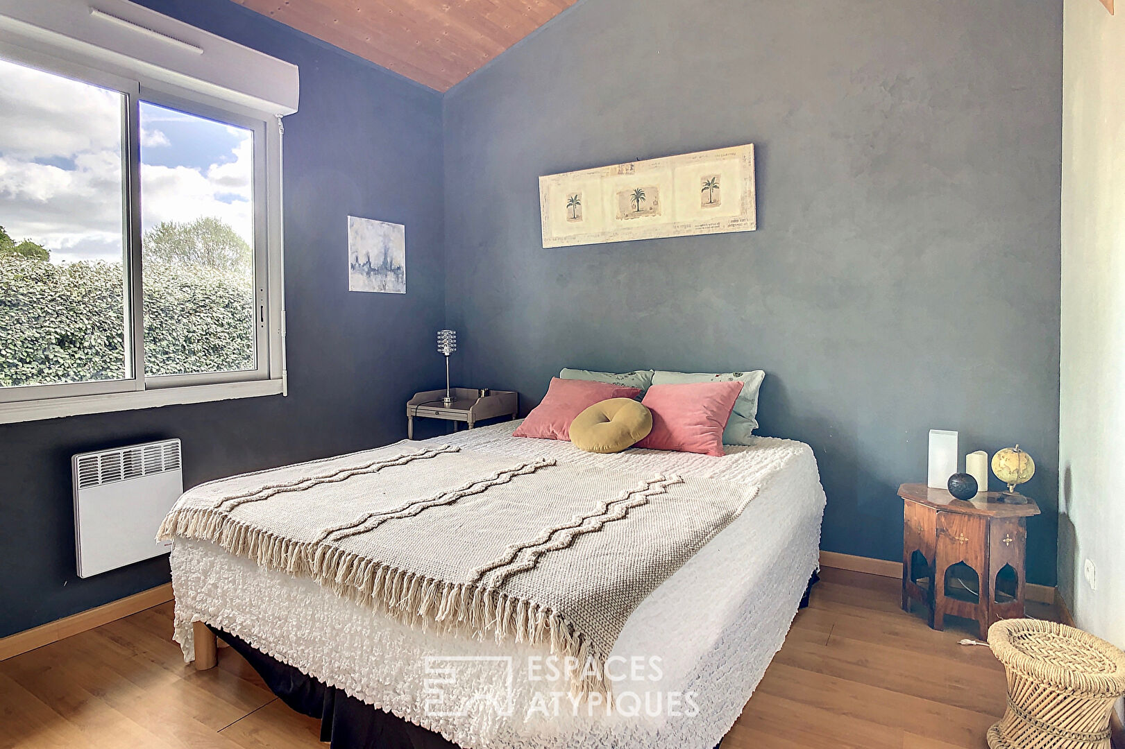 From the entrance, we discover a living room with a beautiful exposed framework, opened by large windows on the garden and the swimming pool. The fully equipped kitchen, open to the dining area, completes the comfort of this house.