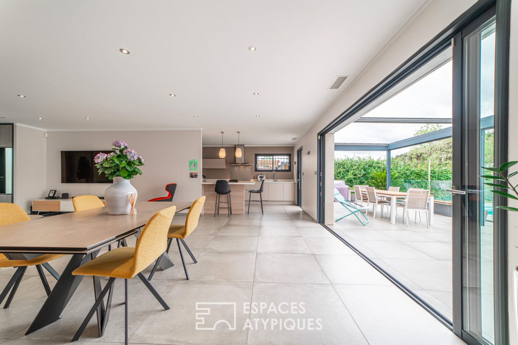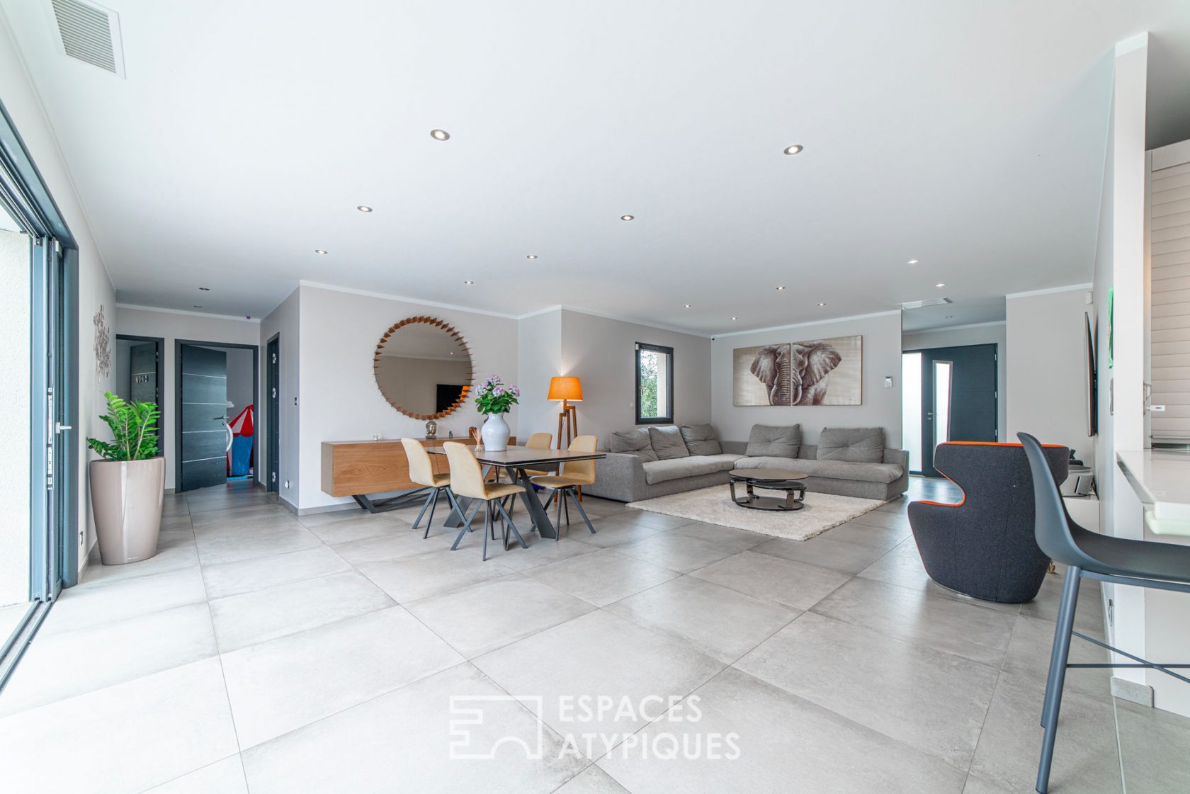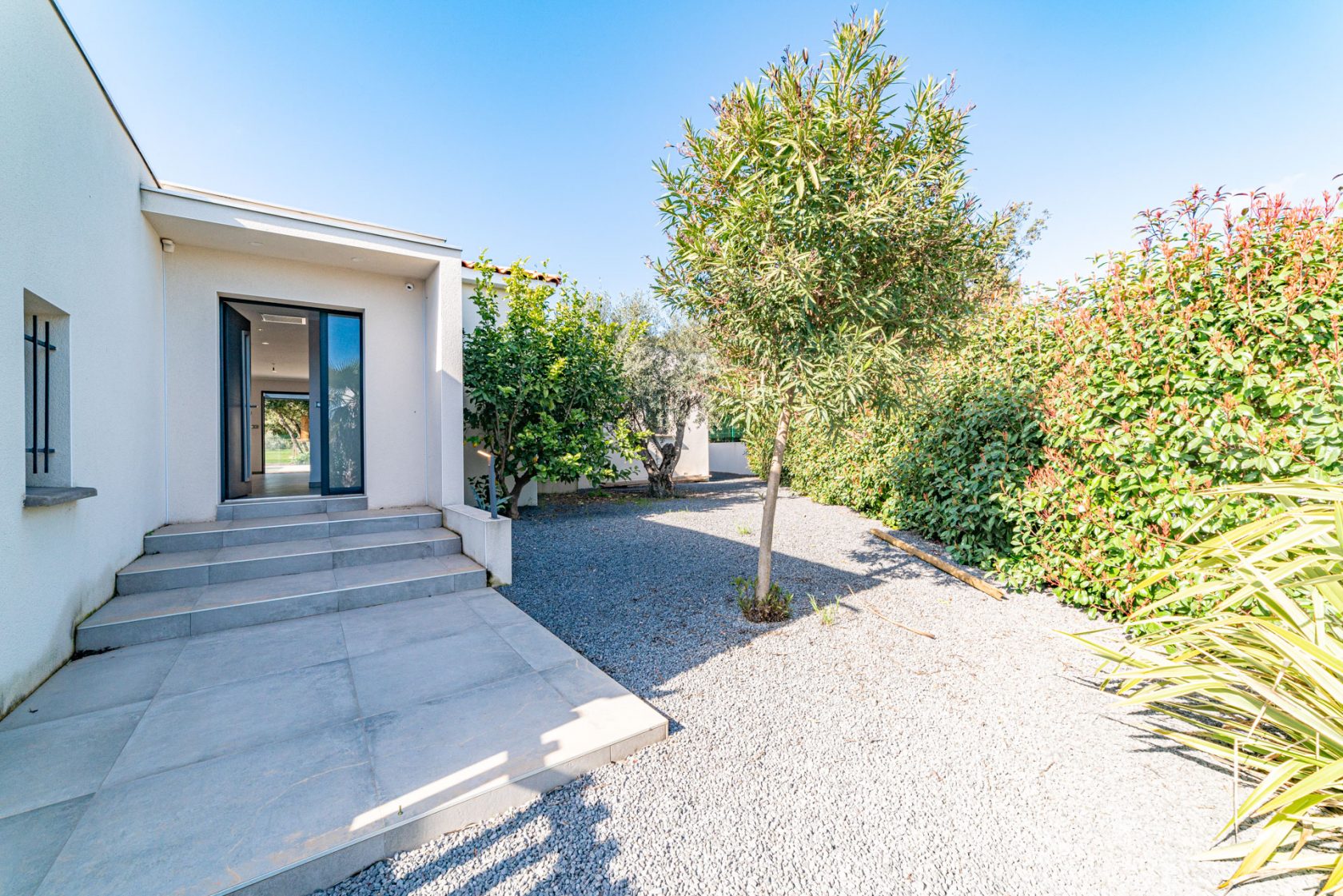 It has all the elements of a contemporary with clean lines, sober colors and a view of a superb wooded garden. Located 15 minutes from the center of Montpellier, this 150m2 single storey built in 2017 is to be visited quickly. The spacious 60 m2 living room is open to the outside by large bay windows in anthracite aluminum. At its side, the brand kitchen has a scullery and direct access to the insulated double garage. The sleeping area is divided into three bedrooms and a master suite with, dressing room, XXL shower and large sink. The shared bathroom has a bathtub. In this space, the imitation parquet tiles give a warm aspect. The whole house is equipped with home automation. The garden is very well maintained with ancient trees and olive trees. A borehole is present and allows the automatic watering to be supplied. The swimming pool is obviously heated and secured by transparent glass elements.