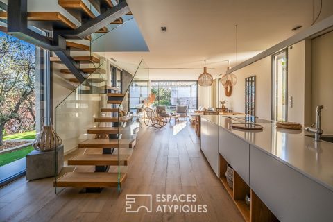 The living room draws us irremediably towards the garden, embellished with a beautiful swimming pool, thanks to its large bay windows and its clarity.