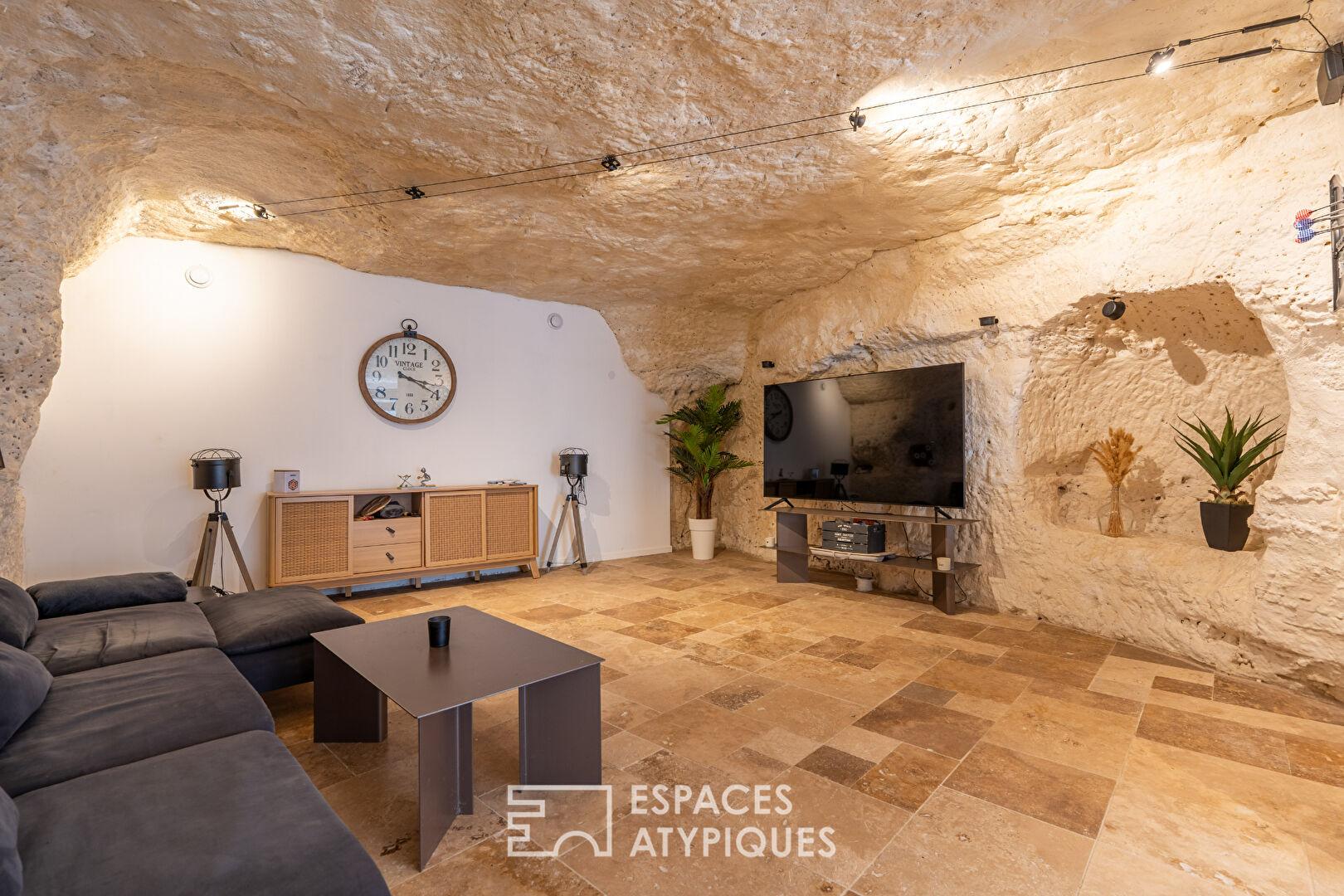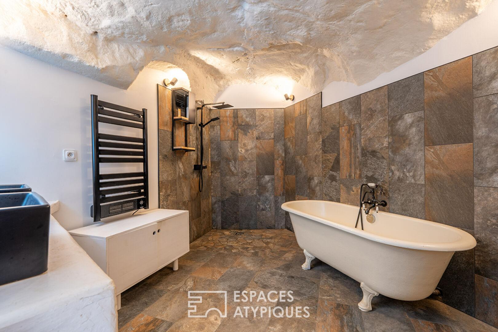 Access is via a cozy wooden terrace, which opens onto a contemporary kitchen combining matte black and natural wood. The ground floor, clad in elegant travertine flooring, leads to a troglodyte living room carved into the rock, enhanced by a wood-burning stove and a staircase combining metal, stone, and glass, a true centerpiece of the place. A bedroom and a bathroom on the same level allow for enjoyable single-story living. Upstairs, a large, bright bedroom benefits from its own private shower room. Finally, on the top floor, a third bedroom with exposed beams completes the ensemble in a warm and authentic atmosphere. Functional and bright, this atypical house also has a small garage, perfect for additional storage.