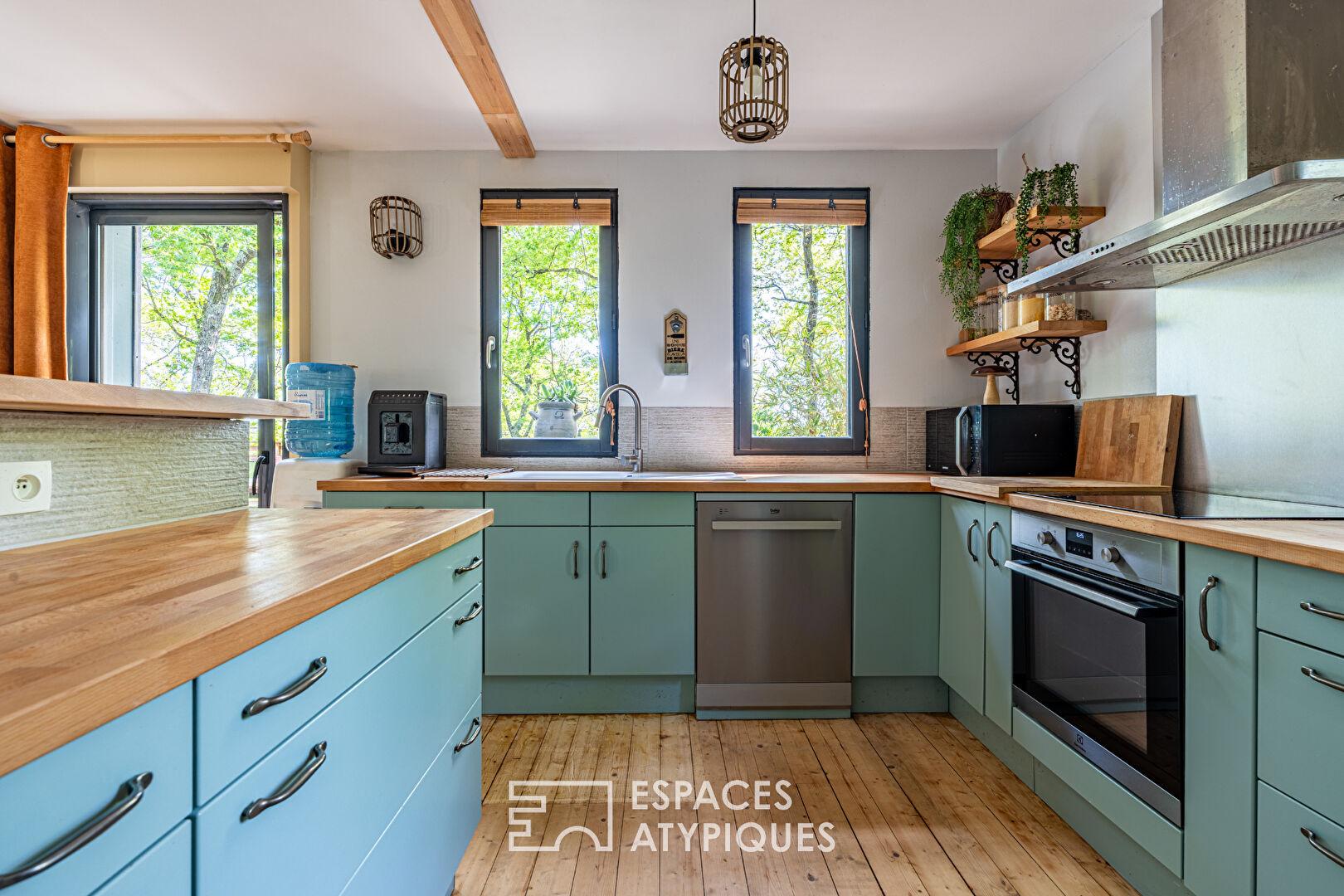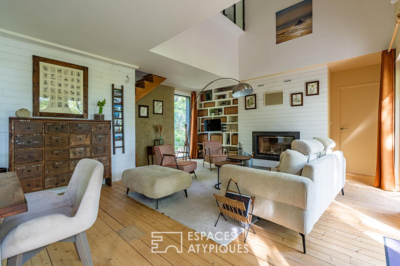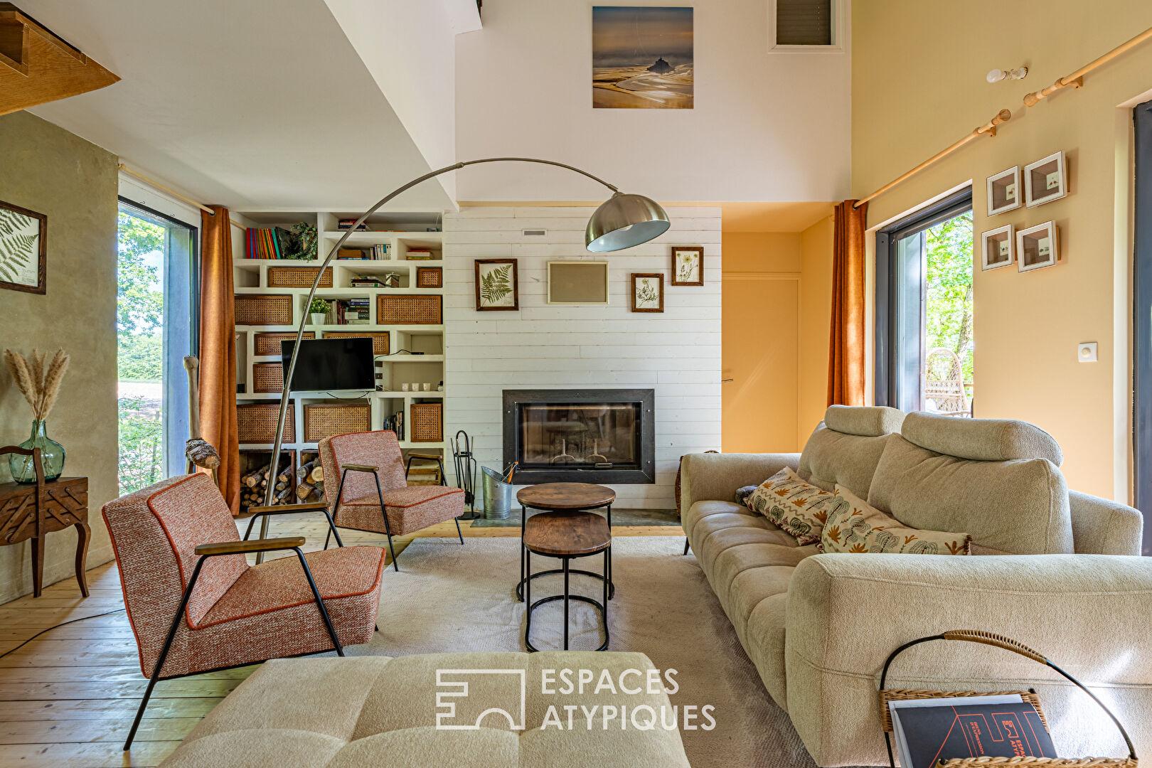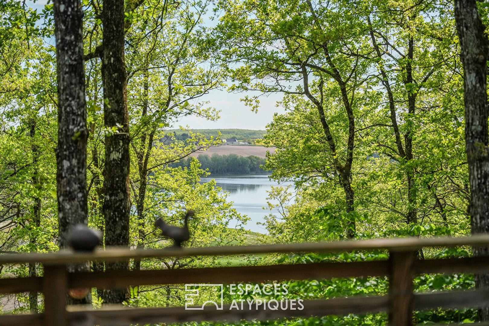 Nestled in the heart of a remarkable natural setting and overlooking Lake Chemillé-sur-Indrois, this superb timber-framed house on stilts offers 245 sqm of living space over three levels on a 1700 sqm plot. On the ground floor and street level, the large living room, with its open-plan fitted and equipped kitchen and beautiful fireplace insert, is bathed in light.