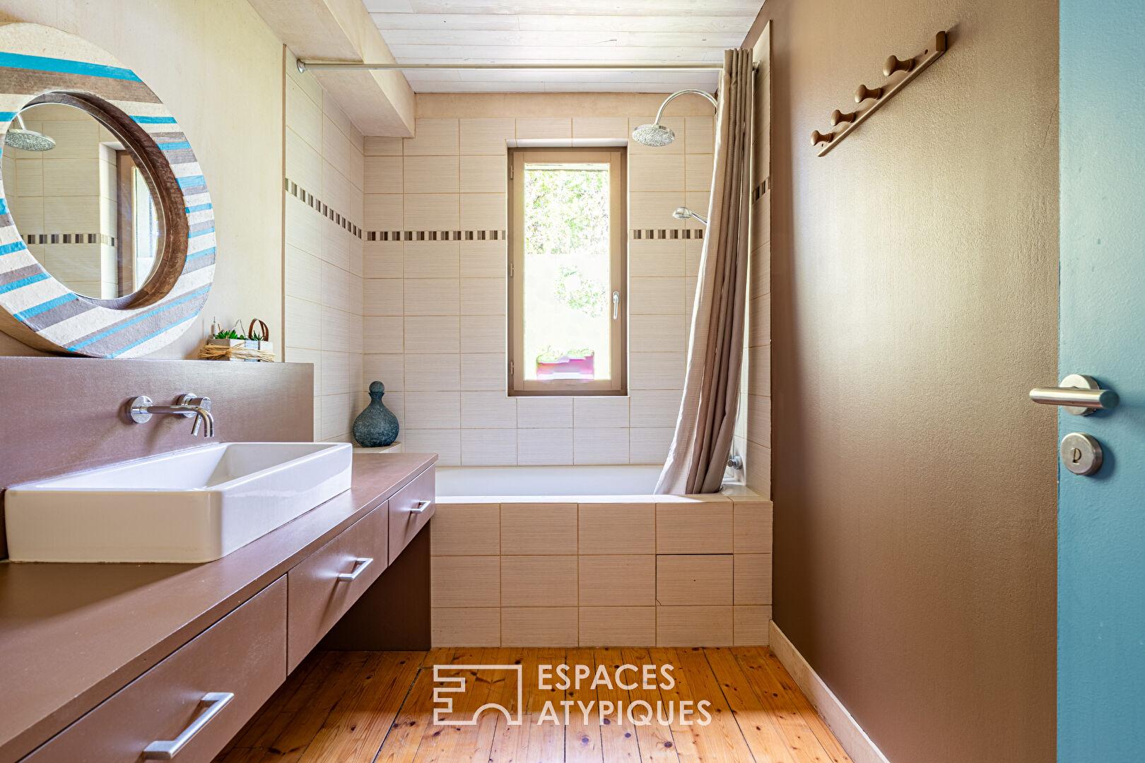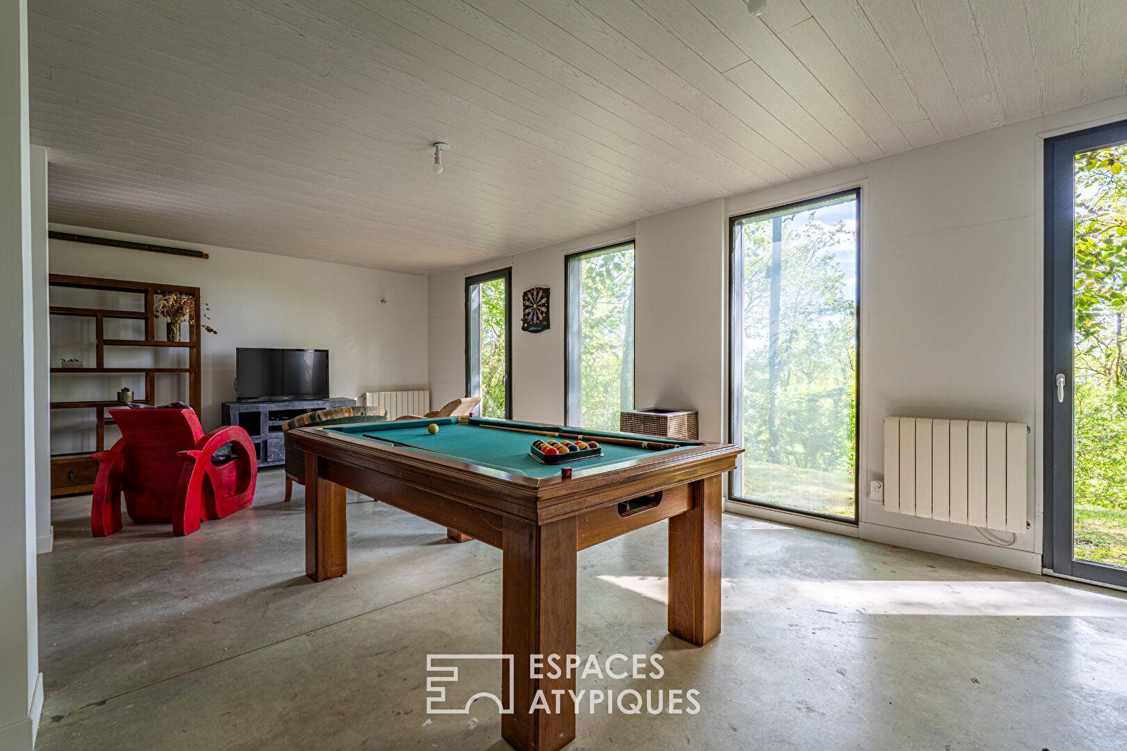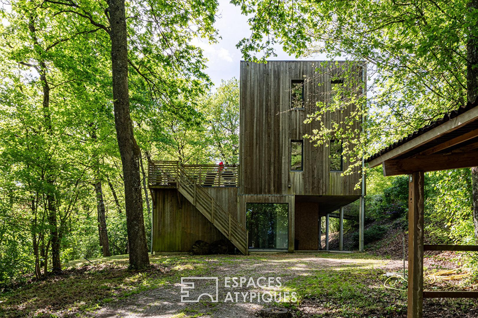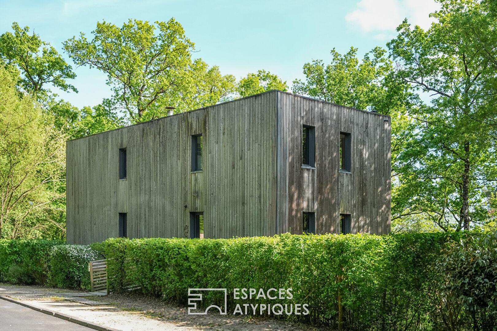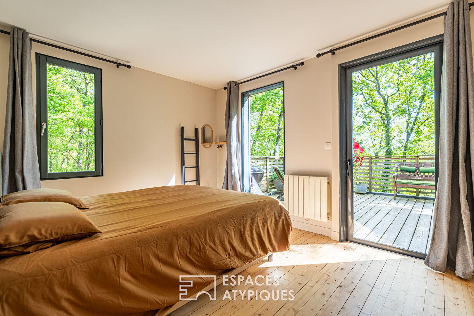 Timber-framed house with terrace and garden in a natural setting