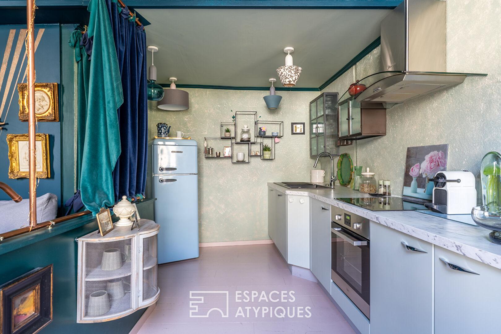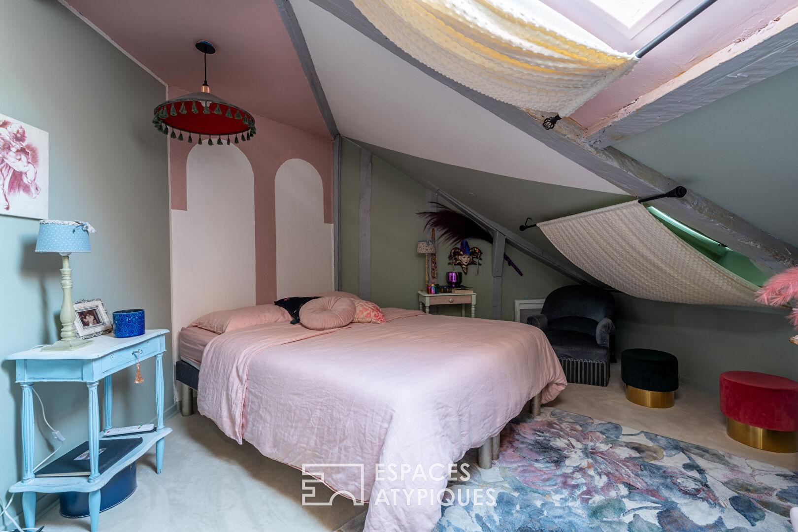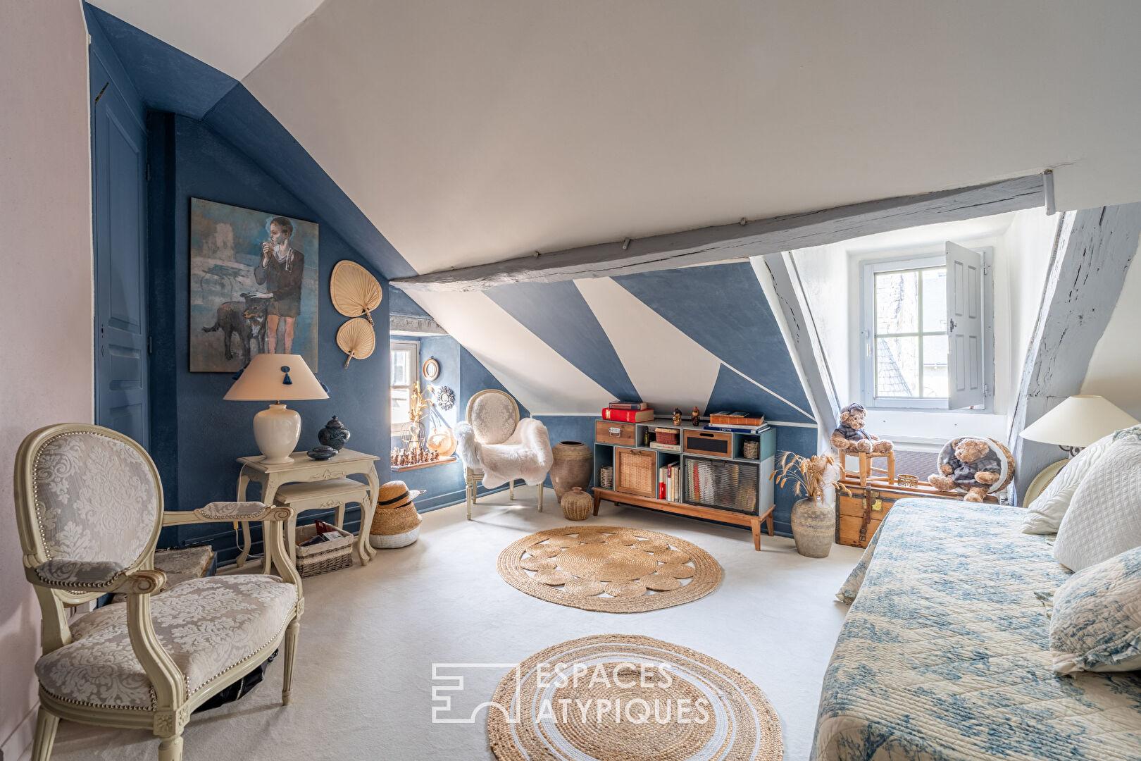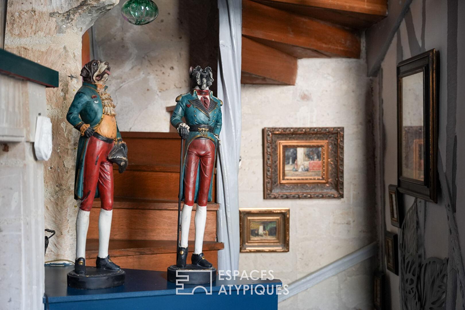 This unique living space charms with its intimate atmosphere and the quality of its amenities. Access is via an old stone tower, where a staircase leads to the different levels. The main level features a light-filled dining room thanks to large windows typical of Touraine houses, extending into a fitted kitchen and a practical laundry room. The warm and inviting living room, centered around a wood-burning stove, forms the heart of the property, where the materials and deep tones highlight the original structure.