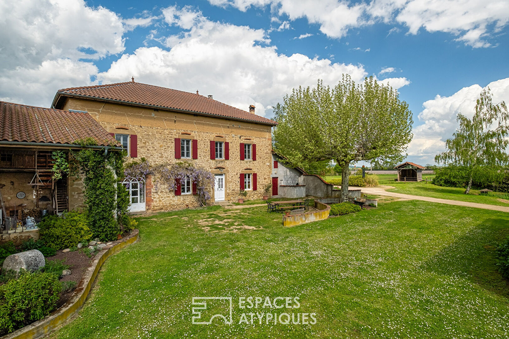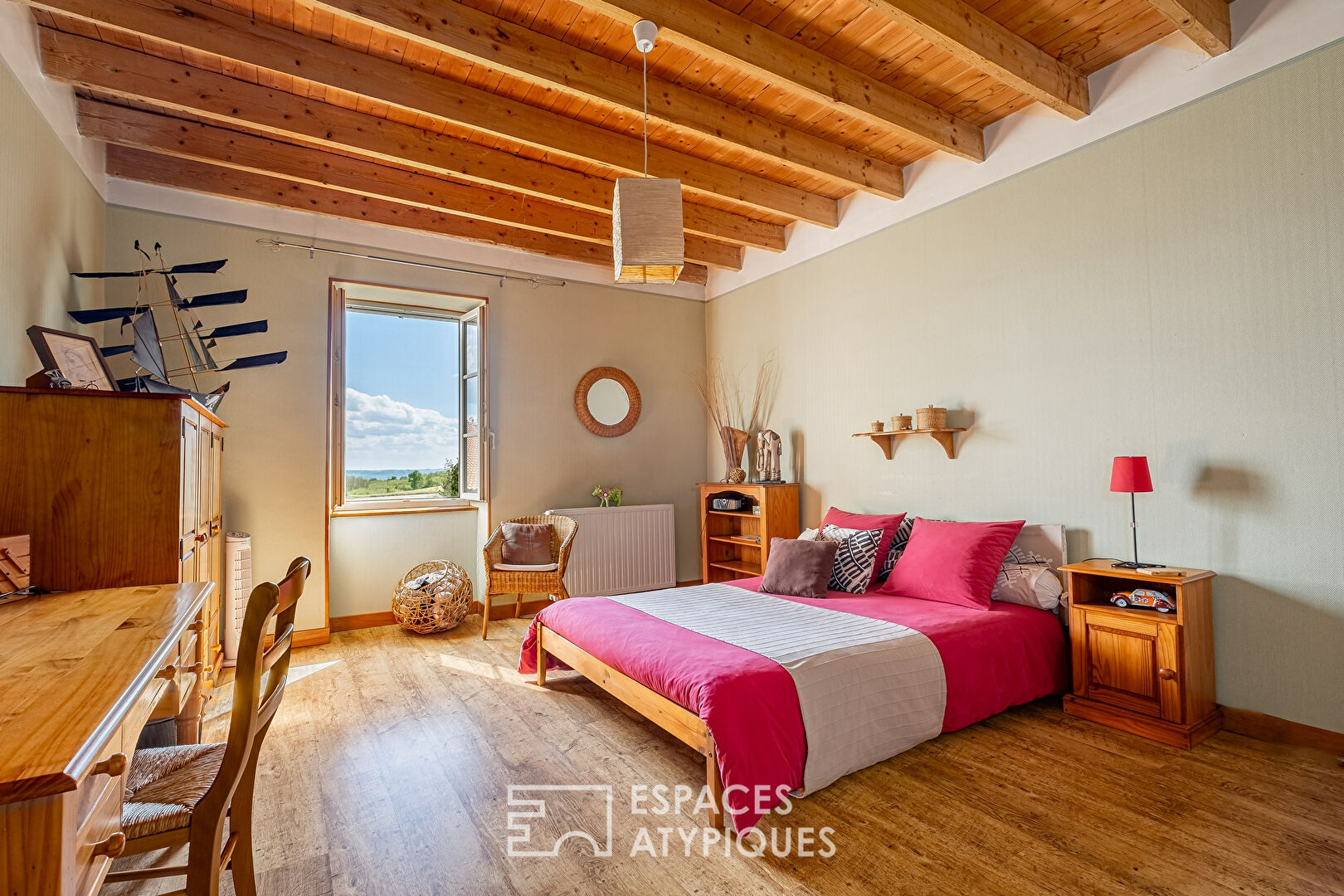 t benefits from a remarkable 360° panorama, ranging from Pilat and the hot air balloons of Ardèche to the snow-capped Alps. The main building houses the habitable part of this complex. On the ground floor, the living room of almost 50m2 consists of a living room and a dining room. The old character has been preserved with high ceilings and exposed beams.