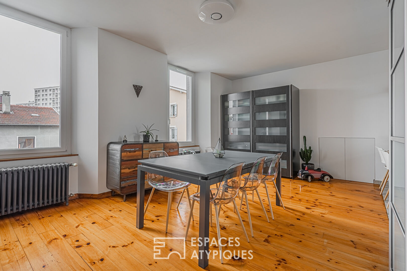 In the town center of Voiron, this duplex of approximately 121 sqm (138 sqm on the ground) is located on the 2nd floor of a building from the 1920s. The discovery of this property renovated, with quality materials, is a real blow of heart and allows you to immediately enjoy the different volumes.