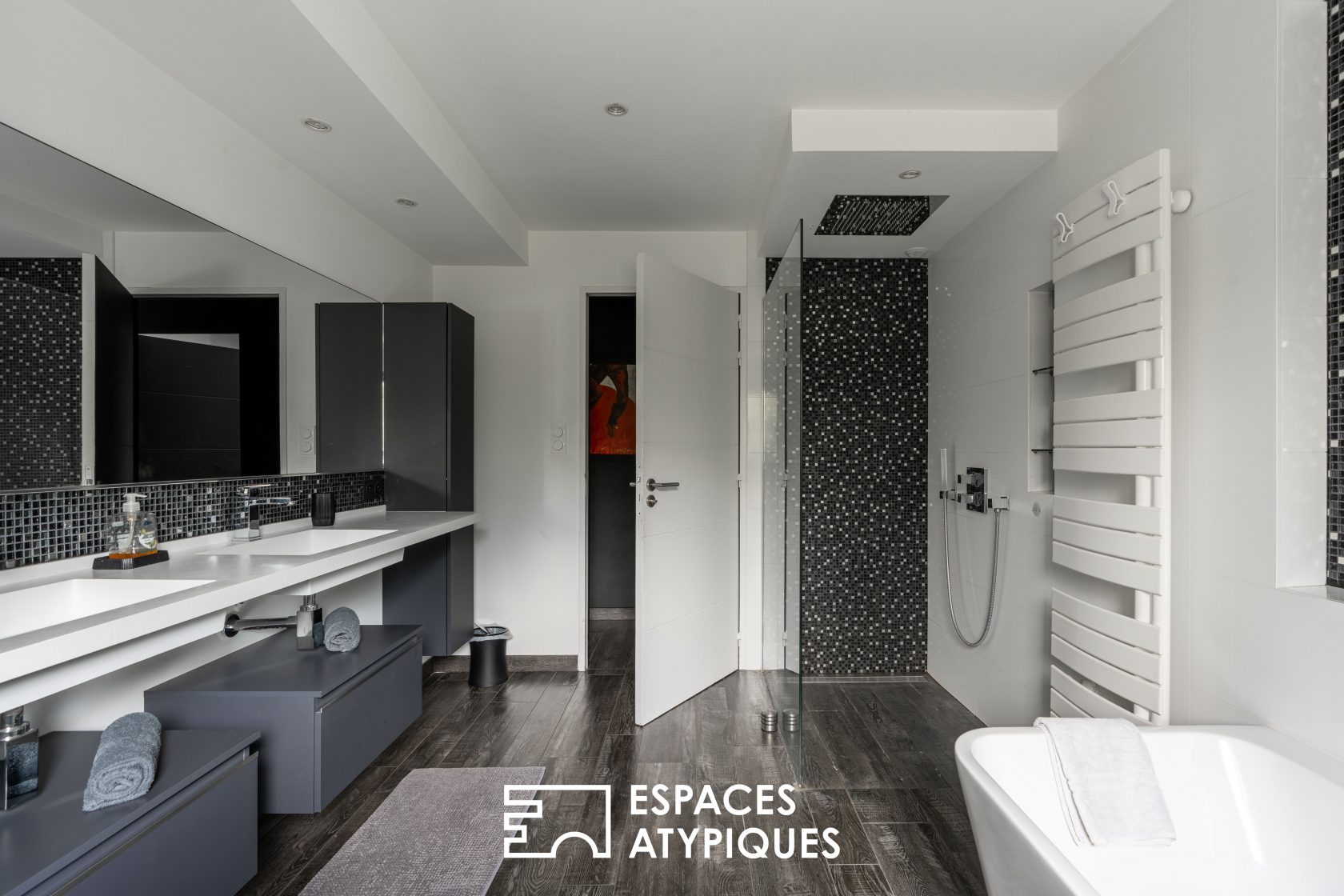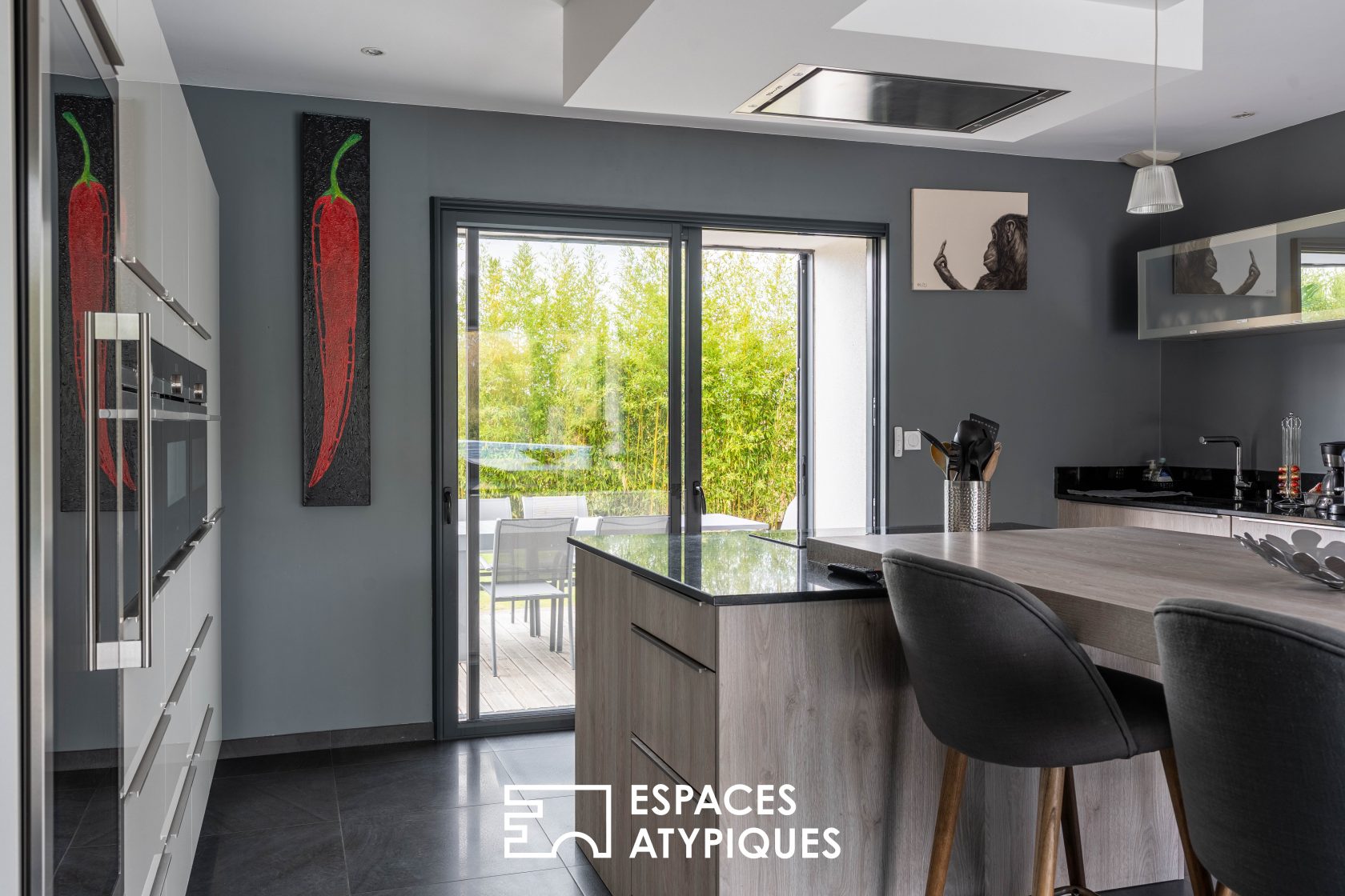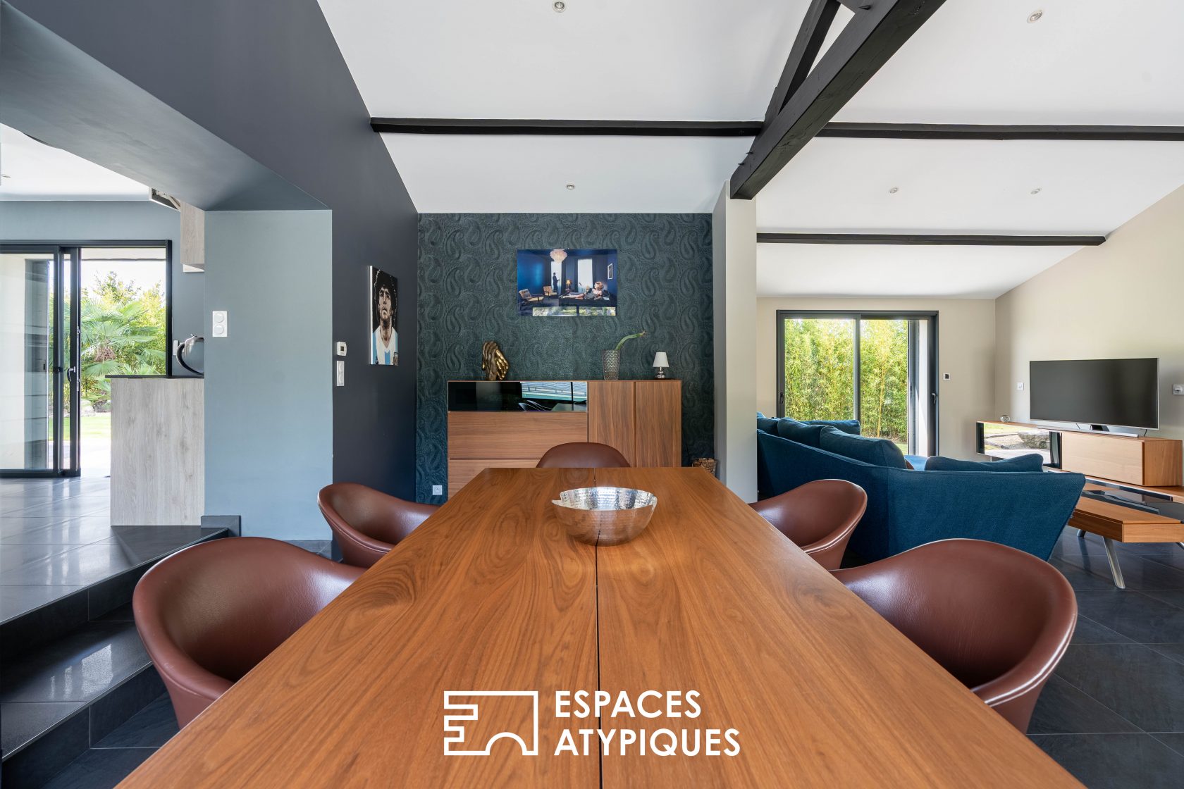 A preview, an exclusive Espaces Atypiques In the heart of the Nantes vineyards, three minutes from the village of La Chapelle-Heulin, this 205 sqm house reinvents the spirit of a farmhouse with a contemporary aesthetic, all set on a wooded plot of 6,390 sqm. Behind its stone walls and under its traditional roof, the interior surprises with its open spaces and resolutely modern atmosphere. The dual-aspect living room plays the card of fluidity, supported by a beautiful high ceiling and exposed beams that structure the space.