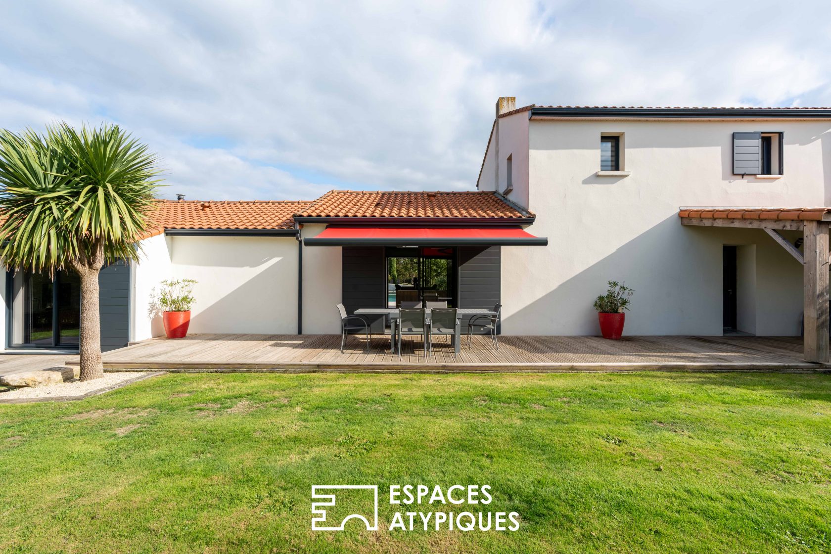 The living room and the dining room, bathed in light thanks to the large openings, open onto the outside and interact with a fitted kitchen with graphic lines. On the night side, two bedrooms, an office and a large bathroom occupy the ground floor, while the upper floor accommodates two additional bedrooms and a shower room. Outside, the adjoining terraces offer several atmospheres, between intimate corners and convivial spaces.