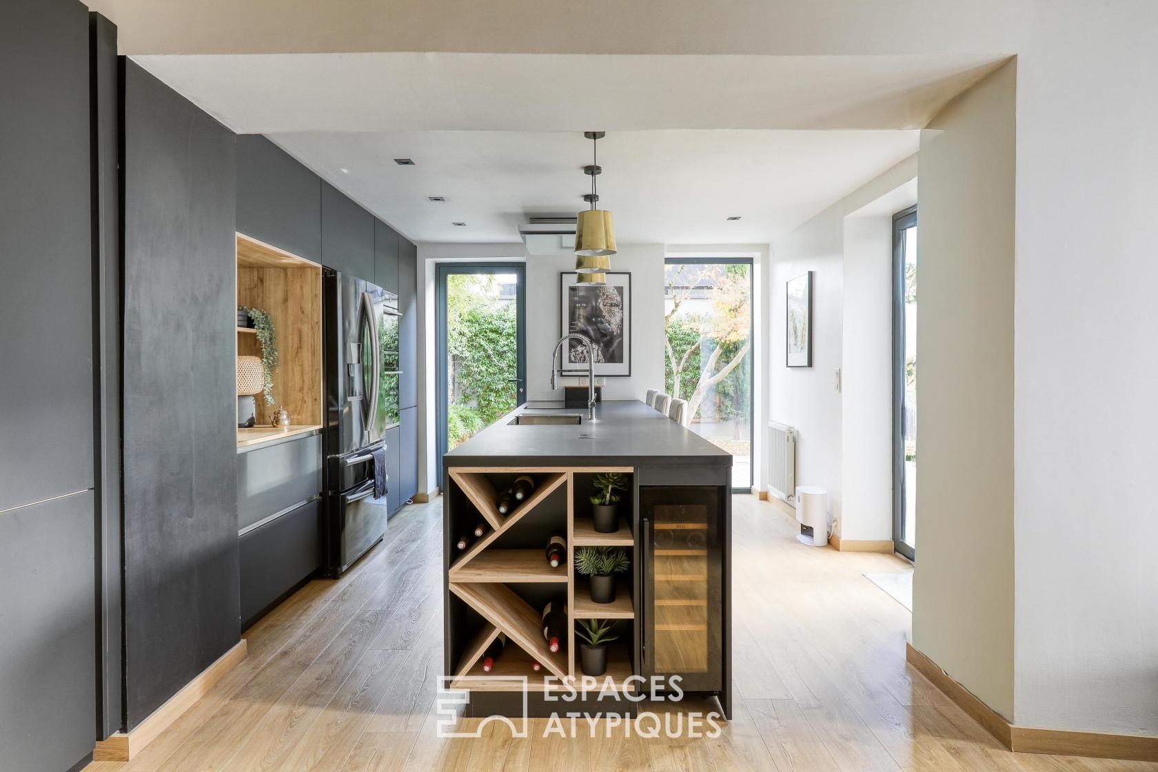 The entrance opens onto a vestibule leading to the spacious living area. Bathed in light, this comfortable space comprises a lounge with garden views, an intimate dining room, and a modern, custom-designed kitchen with clean lines. A wood-burning stove adds a warm and inviting atmosphere to this level. The upper floors are dedicated to the sleeping quarters. The first floor features two bedrooms, one with a dressing room, and a pleasant bathroom with a shower and bathtub. The second floor offers two additional bedrooms.
