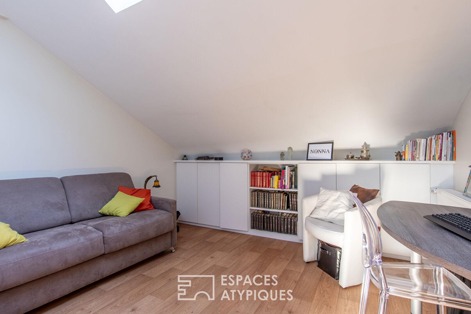 The living room, bathed in light thanks to its numerous windows, offers a warm and elegant living environment in a particularly peaceful setting. The fitted and fully equipped kitchen, subtly separated by a glass partition, blends harmoniously with the reception area and adds a refined architectural touch. The sleeping area comprises three bedrooms and a bathroom with a shower, offering comfort and practicality for everyday living. This property benefits from immediate proximity to all the amenities of city life.