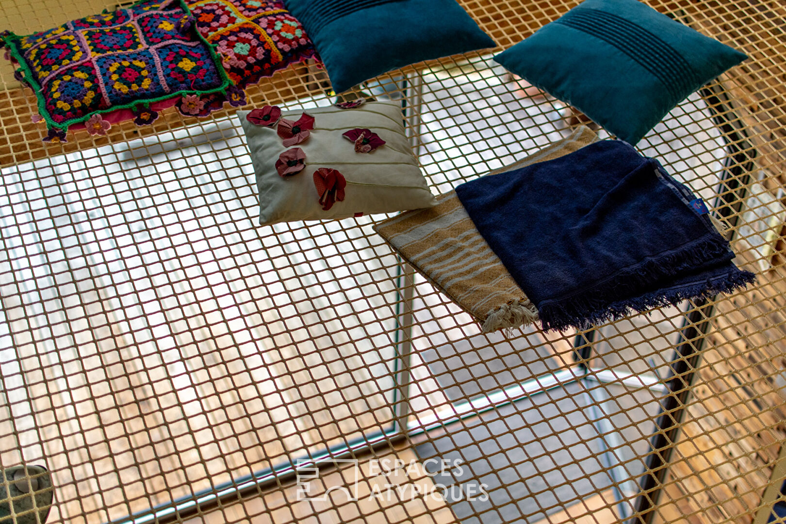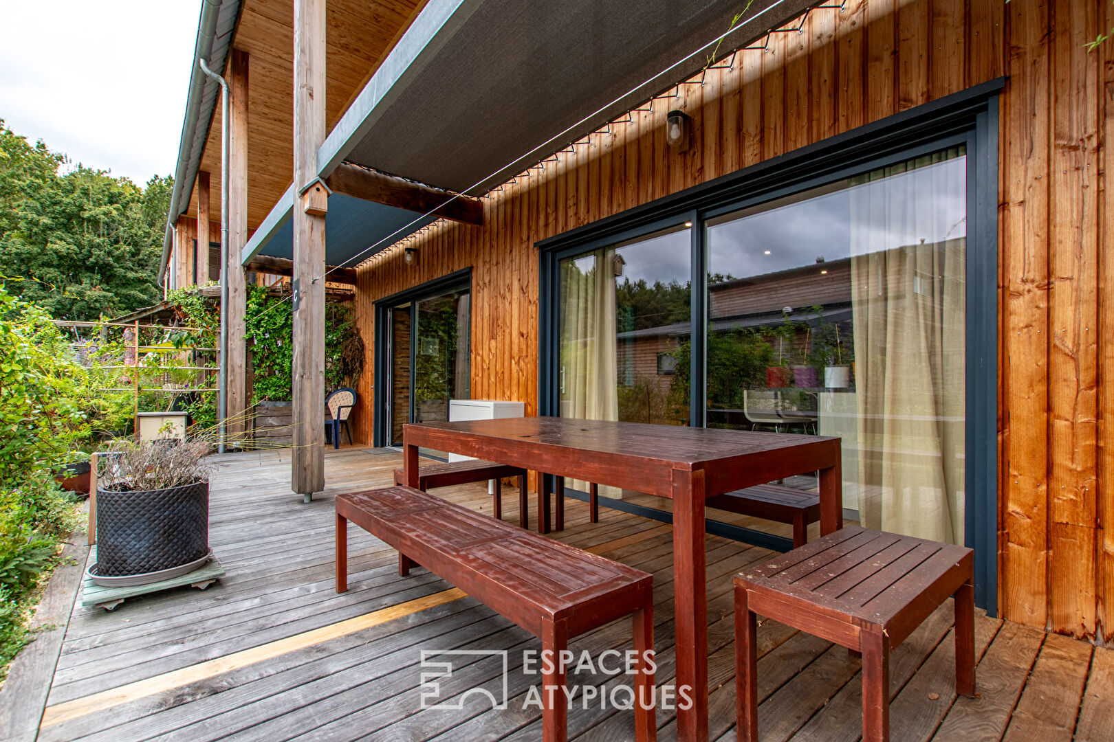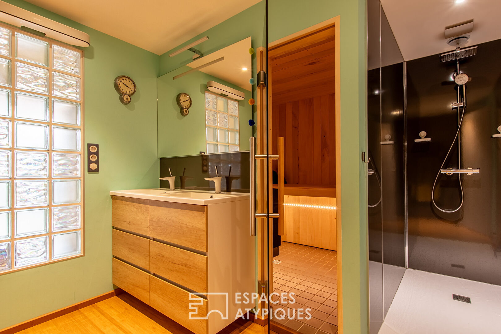 This place seduces with its design, in compliance with the reduction of the carbon footprint combining natural, ecological materials and drawing its resources from renewable energies and its bioclimatic architecture. With its wood-clad walls on the outside and its insulation combining wood wool, Fermacell panels and cork, its pellet stove, its rainwater recovery place this eco-habitat in respect of the environment and the control of energy bills.