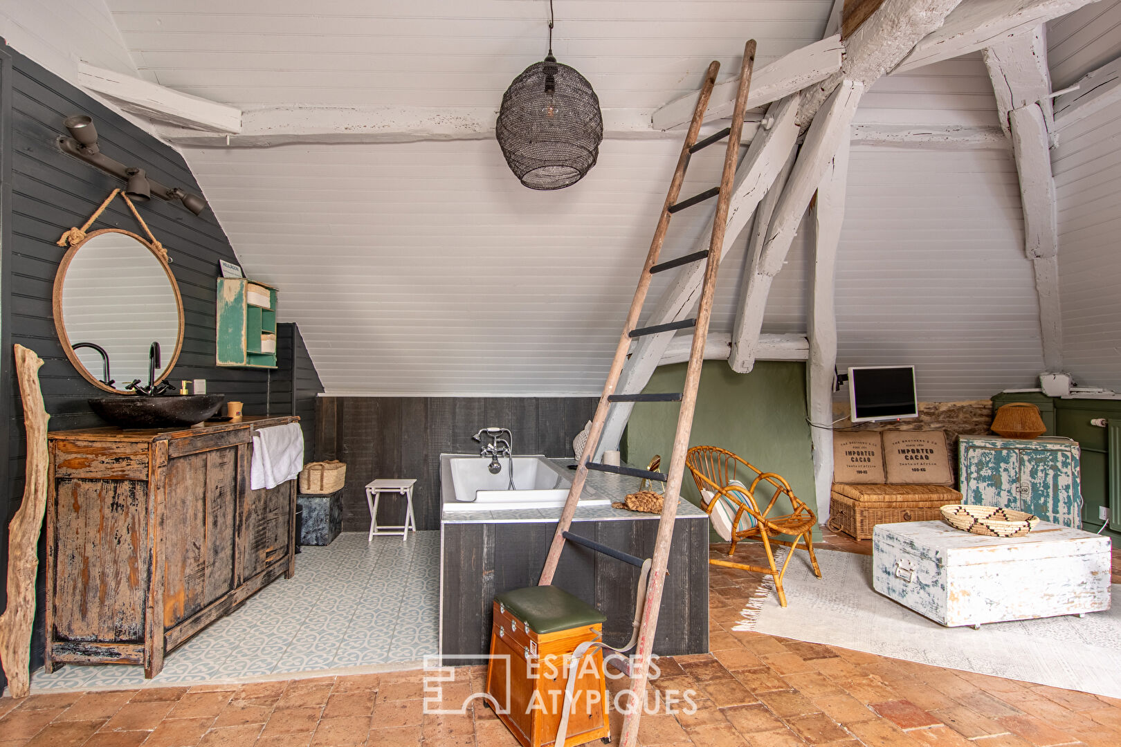 The upper floor houses three charming bedrooms, each with its own en-suite bathroom. In the attic, the second floor reveals a spacious bedroom, where a bathtub sits beautifully under the old beams. Another bedroom with a bathroom, as well as a lounge, completes this level and offers a private and comfortable space.