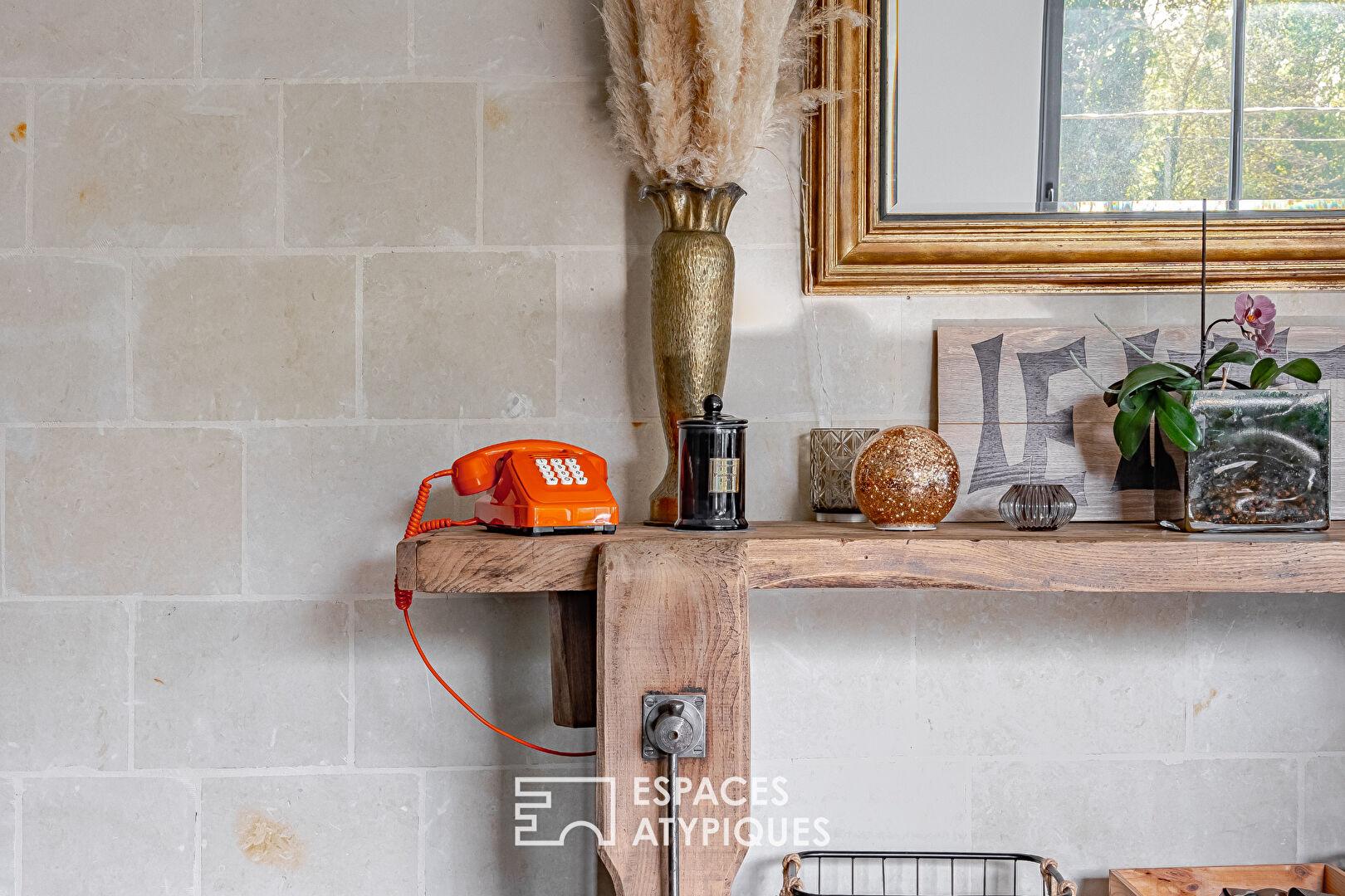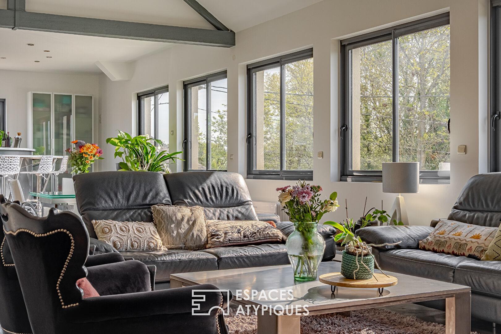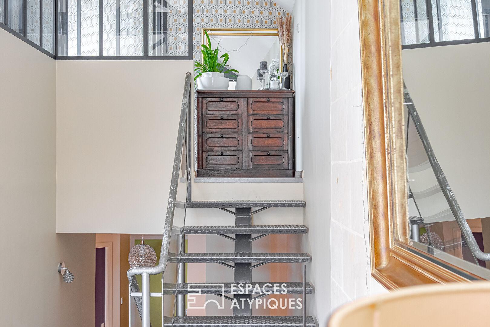 Here, the old breaks the mold. Tuffeau stone and exposed beams meet a renovation with a distinctly industrial character. Black glass partitions, omnipresent metal, a sculptural staircase reminiscent of a spine, polished concrete: every detail makes a statement. Light floods the spaces, revealing an expansive, open, and free-flowing living area where perspectives stretch out, creating a unique energy that blends loft aesthetics with a warm ambiance. From the entrance, the ground floor provides a sense of openness with a bedroom, a laundry room, and direct access to the garage, all designed for practicality and fluidity. The upper level features a sleeping area with two bedrooms and a bathroom, conceived as a transitional landing. Then the loft reveals its full potential: a vast, air-conditioned living space with underfloor heating, where the volumes flow seamlessly together. The living room, dining room, and fully fitted and equipped kitchen intertwine in a free and vibrant layout, enhanced by light and raw materials. Extending from this, the suite stands out as a true signature space, combining a bedroom, dressing room, and bathroom in an atmosphere that is both intimate and assertive, perfectly reflecting the essence of the place.
