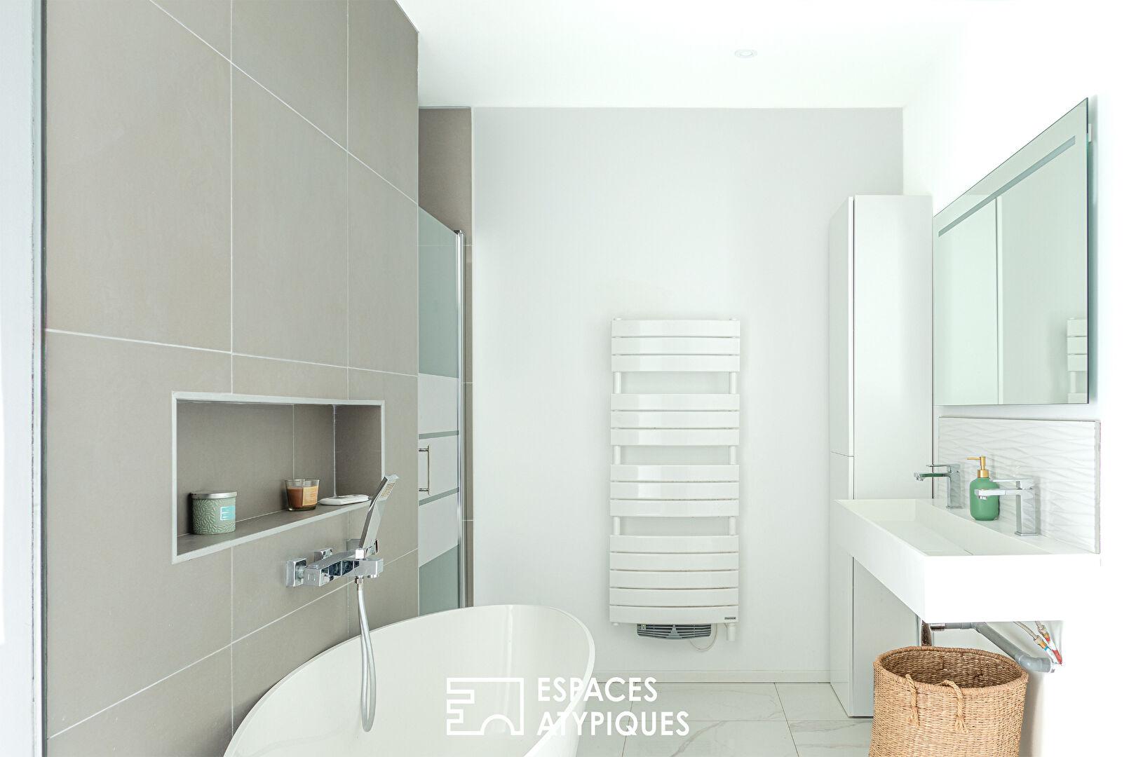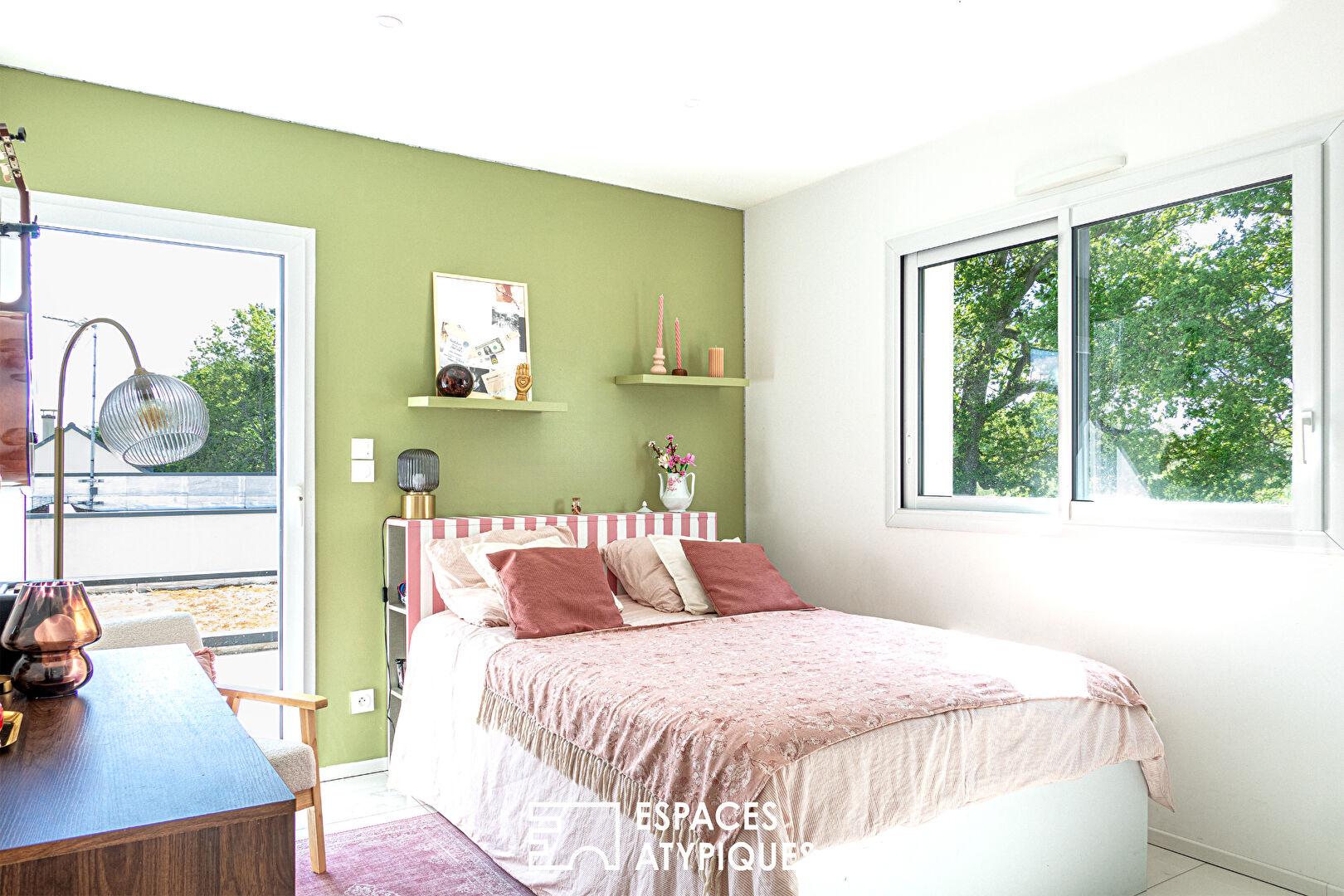 The staircase, a true architectural feature, rises within a glazed volume reminiscent of a tower. It flows into the hallway while diffusing natural light throughout the center of the house, highlighting the contemporary design of the property. Upstairs, the landing leads to two beautiful, light-filled bedrooms, one of which opens onto a terrace offering stunning views of the surrounding area. An office that could easily be converted into an additional bedroom, a laundry room, and a bathroom with a bathtub and shower complete this sleeping area.