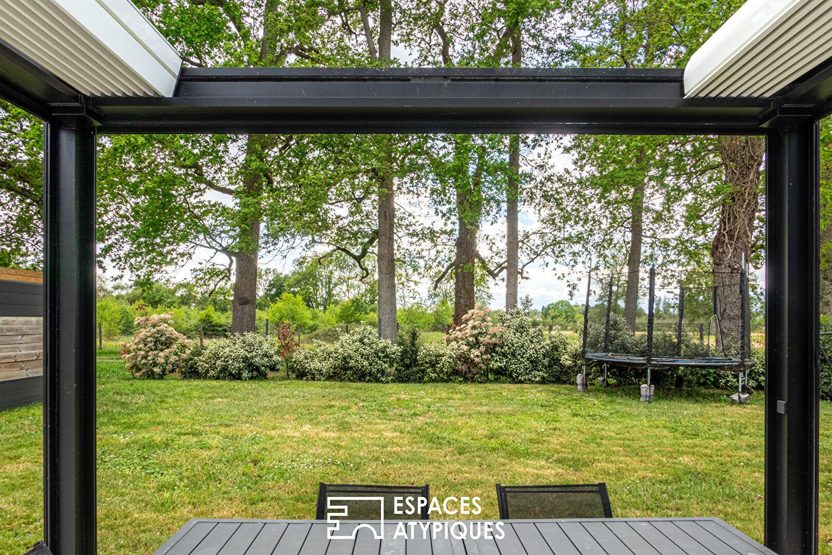 It extends onto a welcoming terrace, offering unobstructed views of the garden and surrounding fields, creating a feeling of spaciousness and freedom every day. The fitted and equipped kitchen blends seamlessly into this living area. Designed to combine aesthetics and practicality, it includes a pantry that serves as a utility room and direct access to the garage.