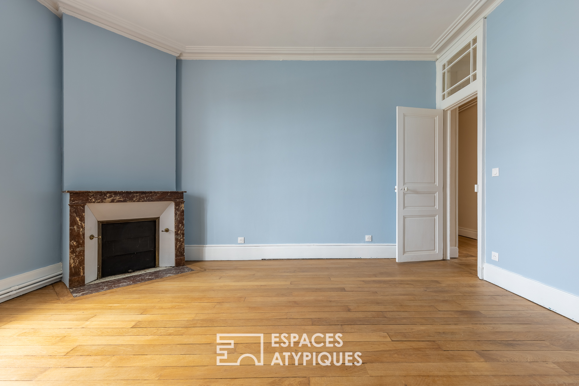 The entrance leads into a living room bathed in light thanks to two large windows. Mouldings, rose windows, high ceilings, period oak parquet flooring and a marble fireplace, the vocabulary is that of early 20th century bourgeois living.