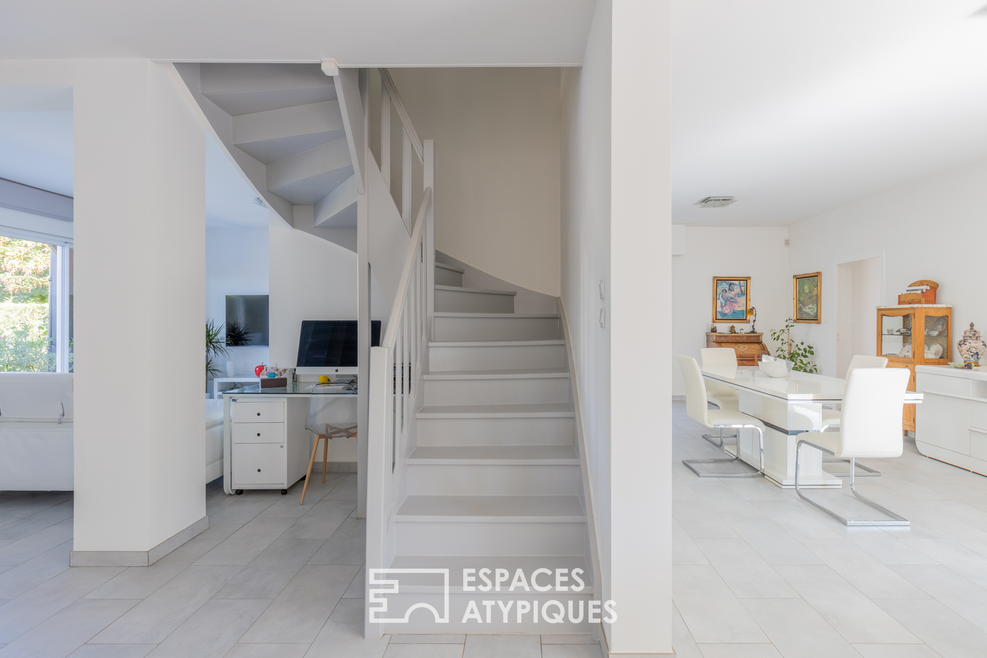 Situated in a residential area, this 287 m² architect-designed house sits on 6 acres of land. It has benefited from high-quality renovation work that has given it a streamlined, light feel, with generous volumes that are ideal for family life.