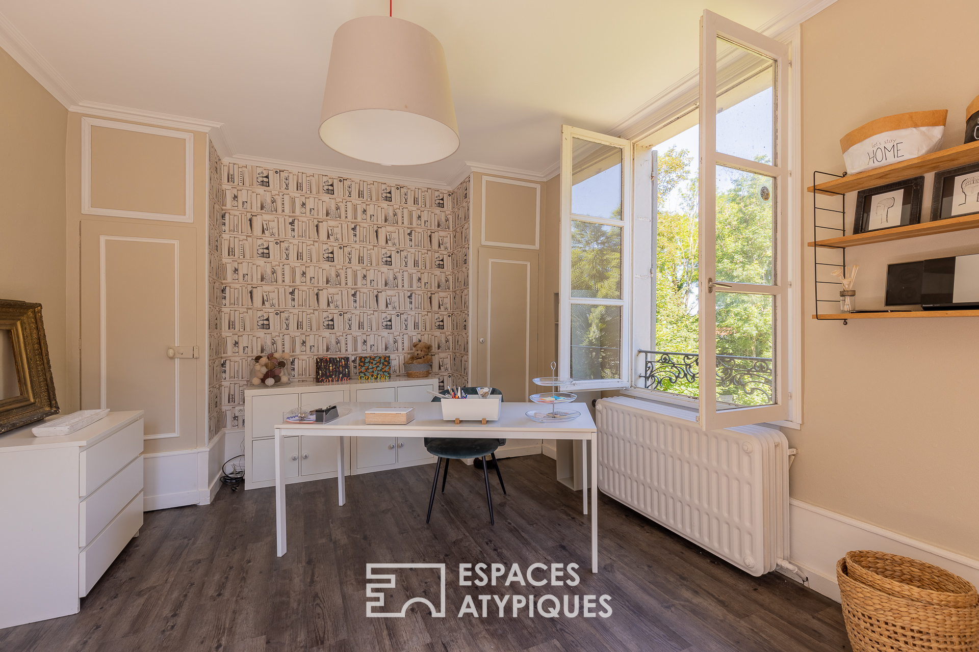 The winter garden, which marks the transition between the interior and the grounds, is an extension of the living room. Bathed in light thanks to its many period arched windows, its charming atmosphere invites you to daydream. It leads to a vast terrace where you can admire the century-old trees. Nestling among the trees is a second wooden terrace with a swimming pool, a real oasis of relaxation amidst the greenery.