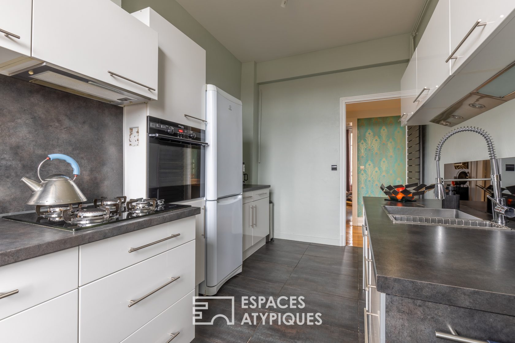 The entrance hall opens onto a corridor that leads to the flat’s various rooms. The living area comprises an adjoining lounge and dining room bathed in light from the wide, high windows. Solid parquet flooring, mouldings, rose windows and 3 metre high ceilings all evoke the vocabulary of last century bourgeois living.
