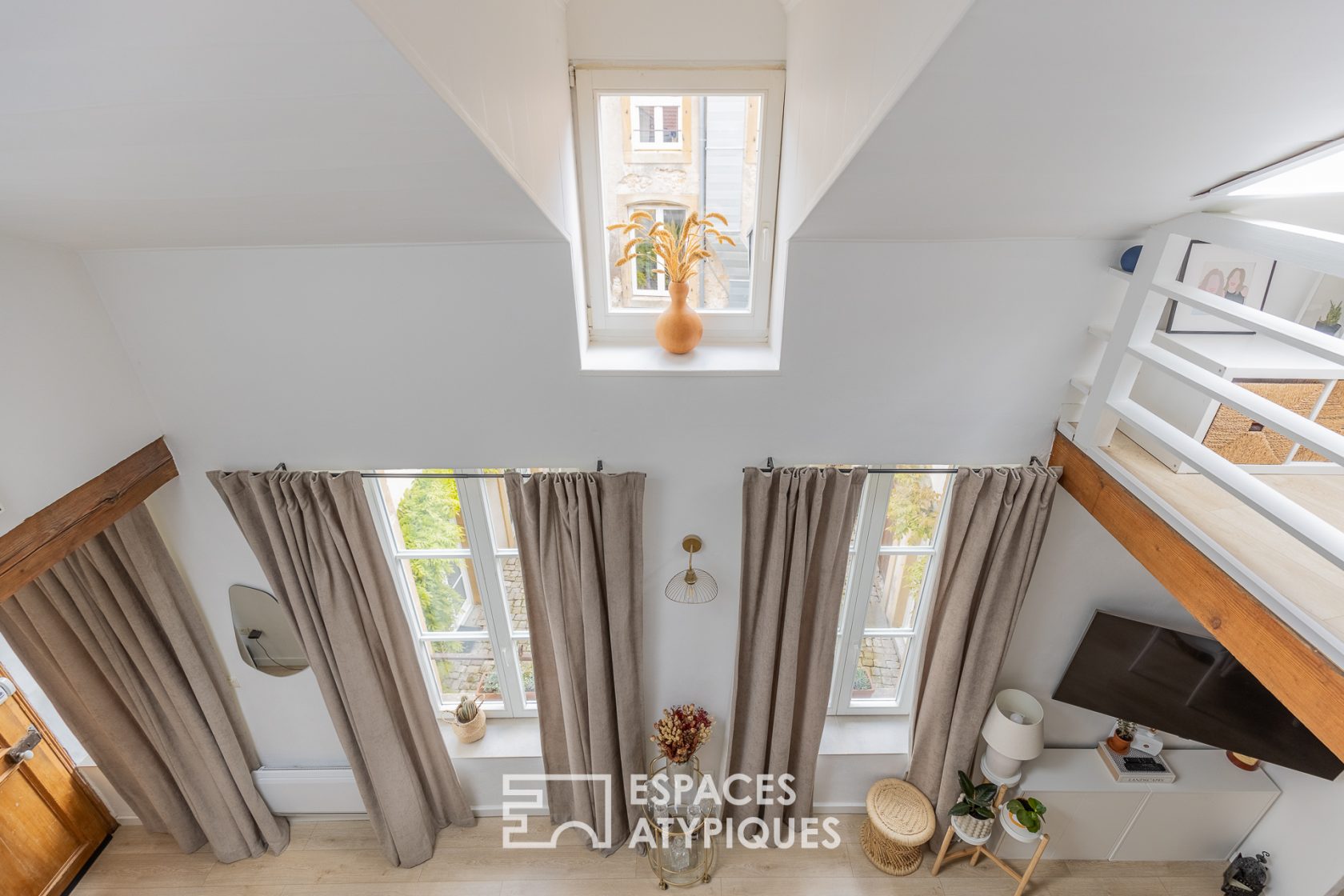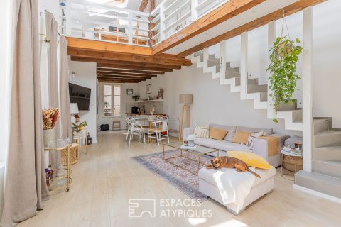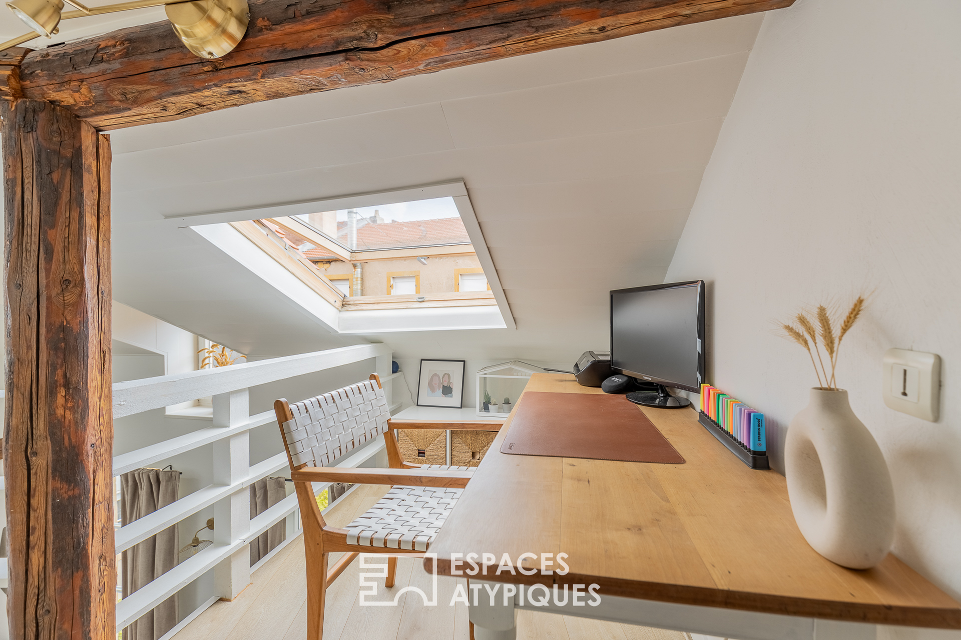 The entrance hall opens onto the living space, with its generous high ceilings offering a pleasant sense of volume. It comprises a living room and an open-plan kitchen, with a dining area as a feature. A pleasant terrace gives you the chance to enjoy the outdoors in the heart of the city. The warmth of the wooden beams and exposed roof timbers is contrasted by the minimalist, uncluttered décor. A shower room completes this first level.