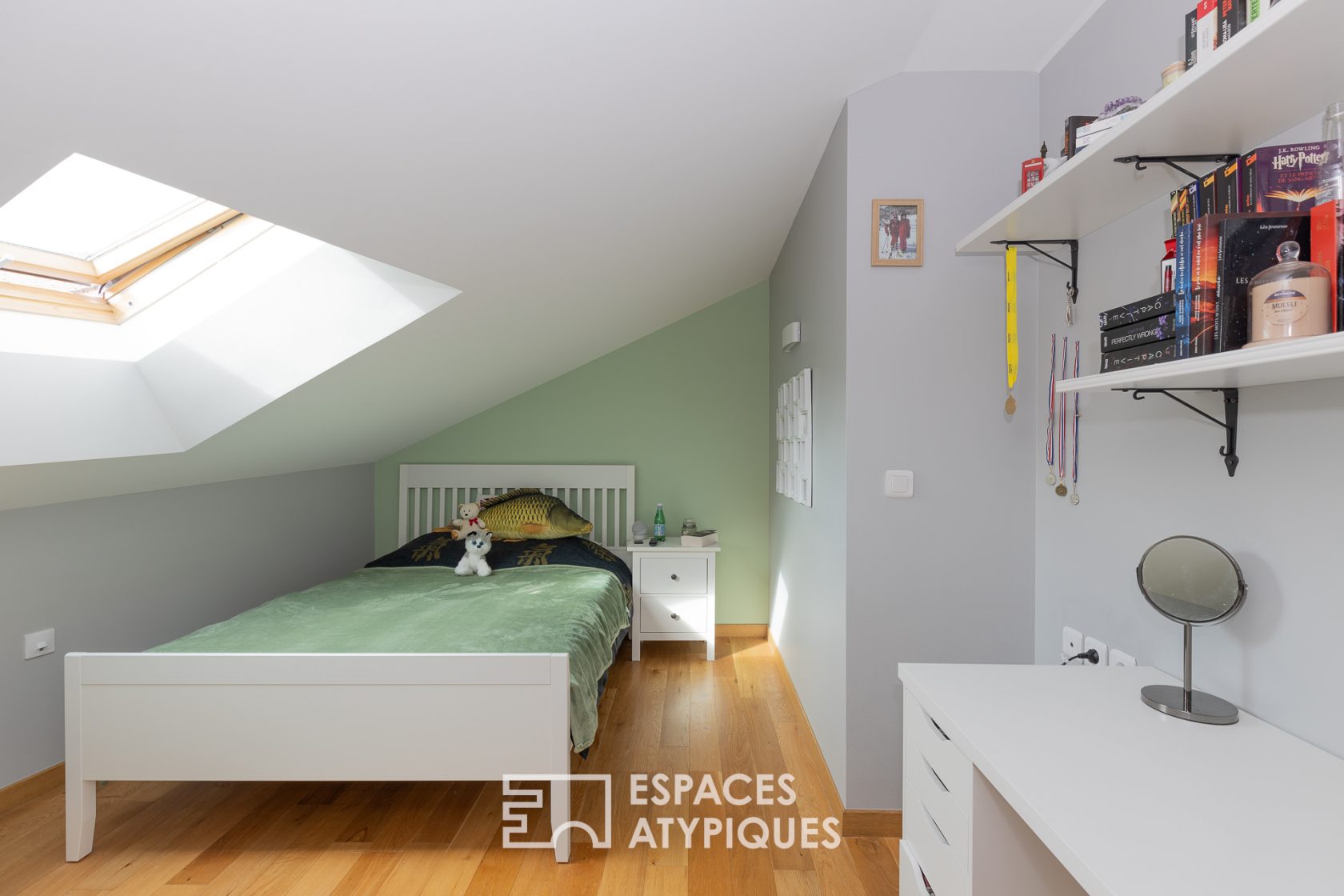 As soon as you cross the threshold, a vast, light-filled living space opens up on the ground floor. The fully-equipped kitchen opens onto the living room, inviting you to spend time with family and friends. A large bay window gives access to the terrace and garden, extending the interior space outwards and allowing you to make the most of the fine weather.