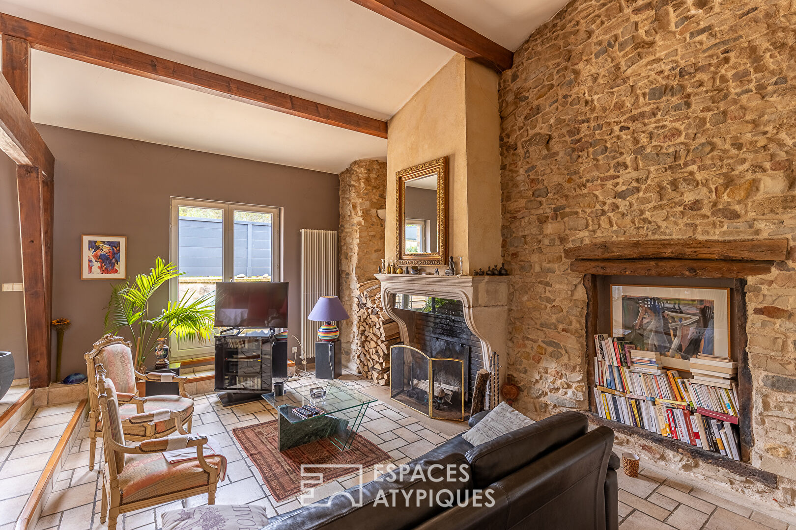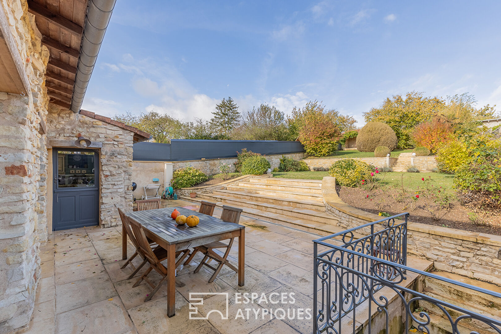 The entrance to the property from the street is marked by an old cobbled courtyard topped by a porch adorned with greenery. A stone stairway leads up to the first floor of the building, which houses the living areas. The warm and luminous living room with its exposed beams is warmed by a majestic period fireplace. The dining kitchen is an extension of this, offering generous space and access to a vast terrace. This marks the transition to the carefully tended, terraced garden, which gives the property an atmosphere inspired by the South of France. At the top of the garden, a stone outbuilding is accompanied by a bucolic terrace inviting you to relax.