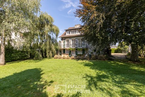 Bathed in light thanks to its many windows, the living room is enhanced by its Comblanchien marble floor and warmed by the presence of a wood-burning stove and wooden beams. It is separated from the study by a beautiful cross-shaped sliding door. The independent kitchen, whose surface area can be comfortably increased by the presence of a pleasant adjoining room, can be reinterpreted according to your desires.