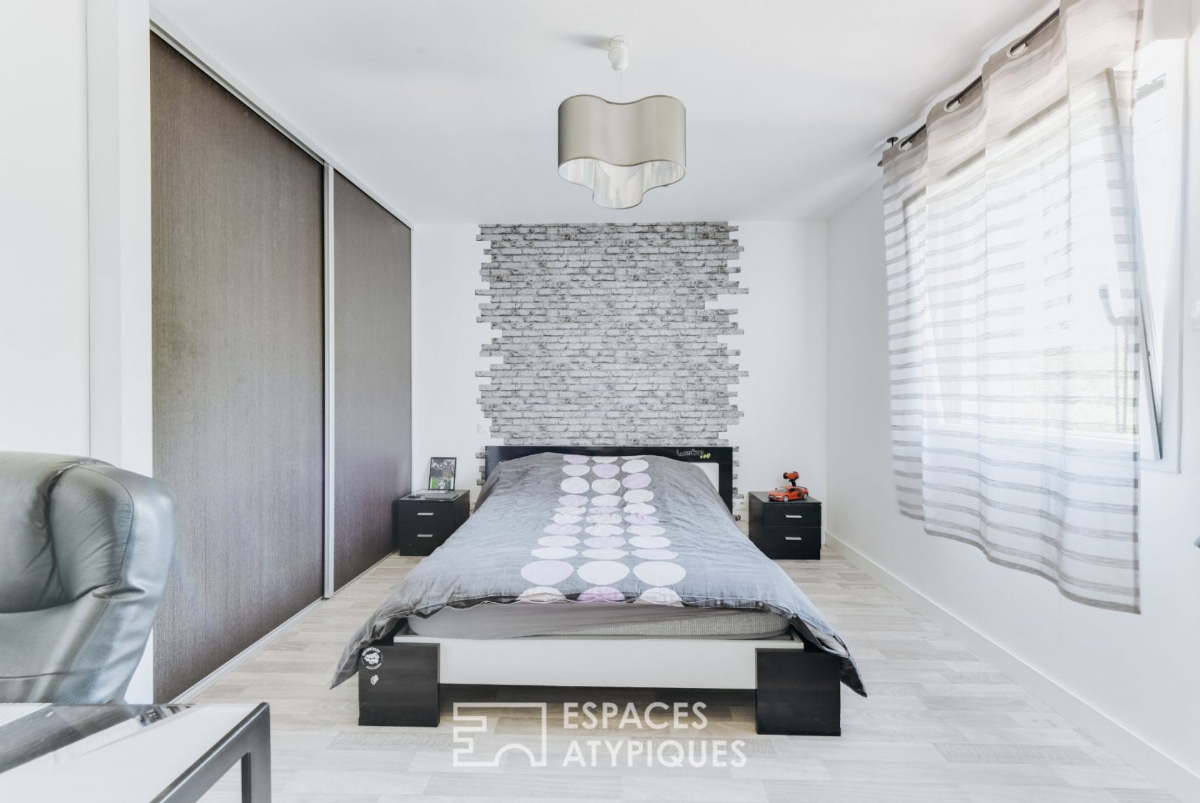 The entrance hall, equipped with cupboards, reveals the large living room which serves as a dining room. On the right, the ultra modern and very spacious kitchen enjoys the light of the large bay directly on the terrace. The living room is in the extension of the dining room. Slightly intimidated by a canopy, it offers comfort and light.