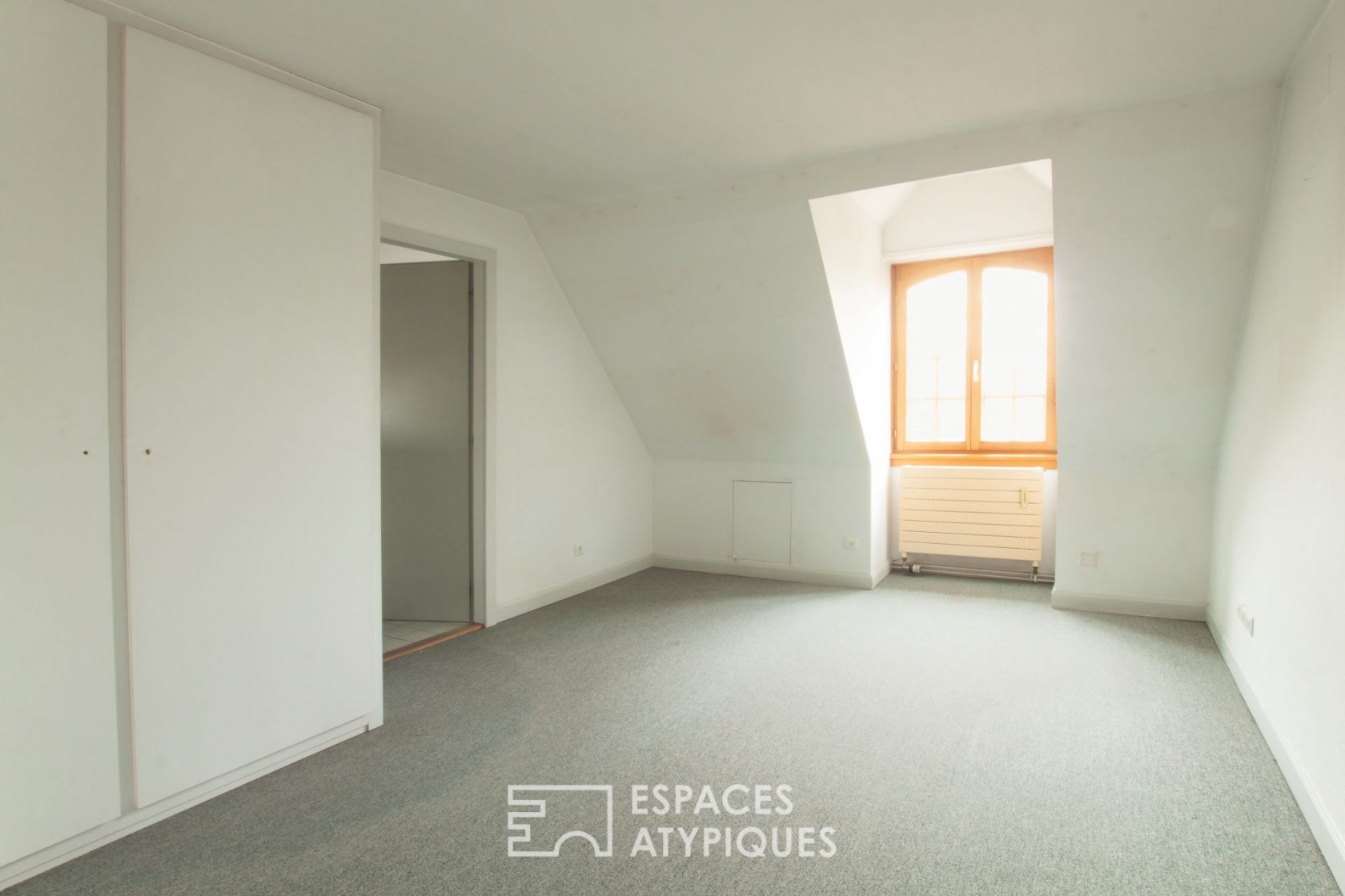 The entrance opens onto a large open space of 75m² bathed in light. Attic rooms and atypical furnishings give a real character to this living room. It serves a dining kitchen as well as two bedrooms each with their own bathroom. Another originality of the place, an underwater staircase leads to the upper floor composed of an open space of 57m² with exposed beams.