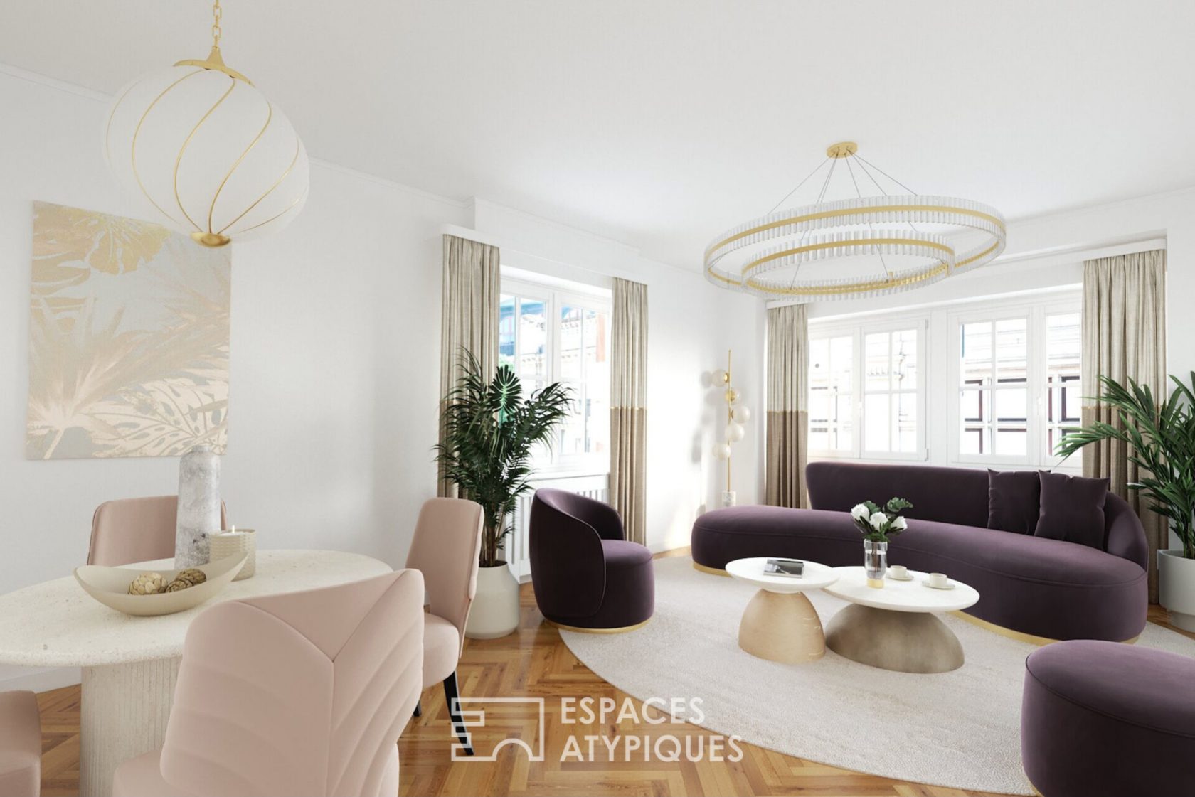The entrance opens onto a pleasant 13 m² space that distributes the various rooms. The original herringbone parquet flooring suggests a renovation in a style that harmoniously blends the charm of the old with contemporary purity. The 20 m² (215 sq ft) living room with a view of the top of the cathedral is adjoined on either side by two bedrooms of 22 and 14 m² (430 sq ft) respectively. A bathroom as well as a vast dining kitchen of 14 m² extended by a loggia complete the services of this property.