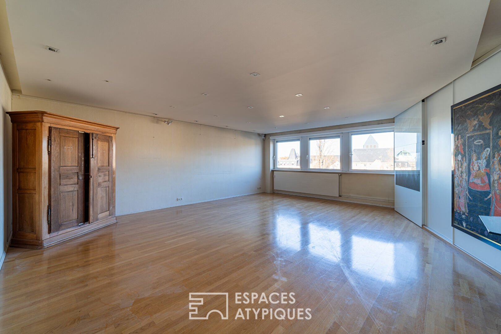 A comfortable marble-floored entrance hall opens onto a vast 44 m² living room with uninterrupted views over the quays and the first rooftops of the Neustadt. On the other side, the separate dining kitchen opens onto a balcony with an impressive view of the Cathedral.