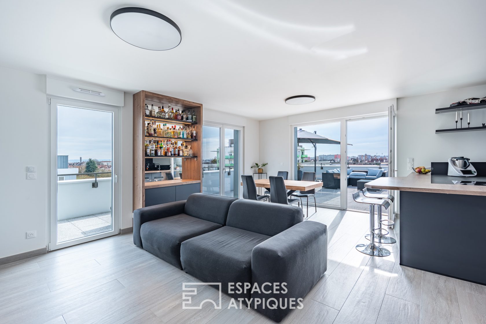 Located just a few minutes from Strasbourg, this 88 m2 flat is on the fifth and top floor with lift of a condominium built in 2021. Accessible from every room in the flat, its exceptional 129 m² south-west facing terrace offers an unobstructed panoramic view and is a real additional living space.
