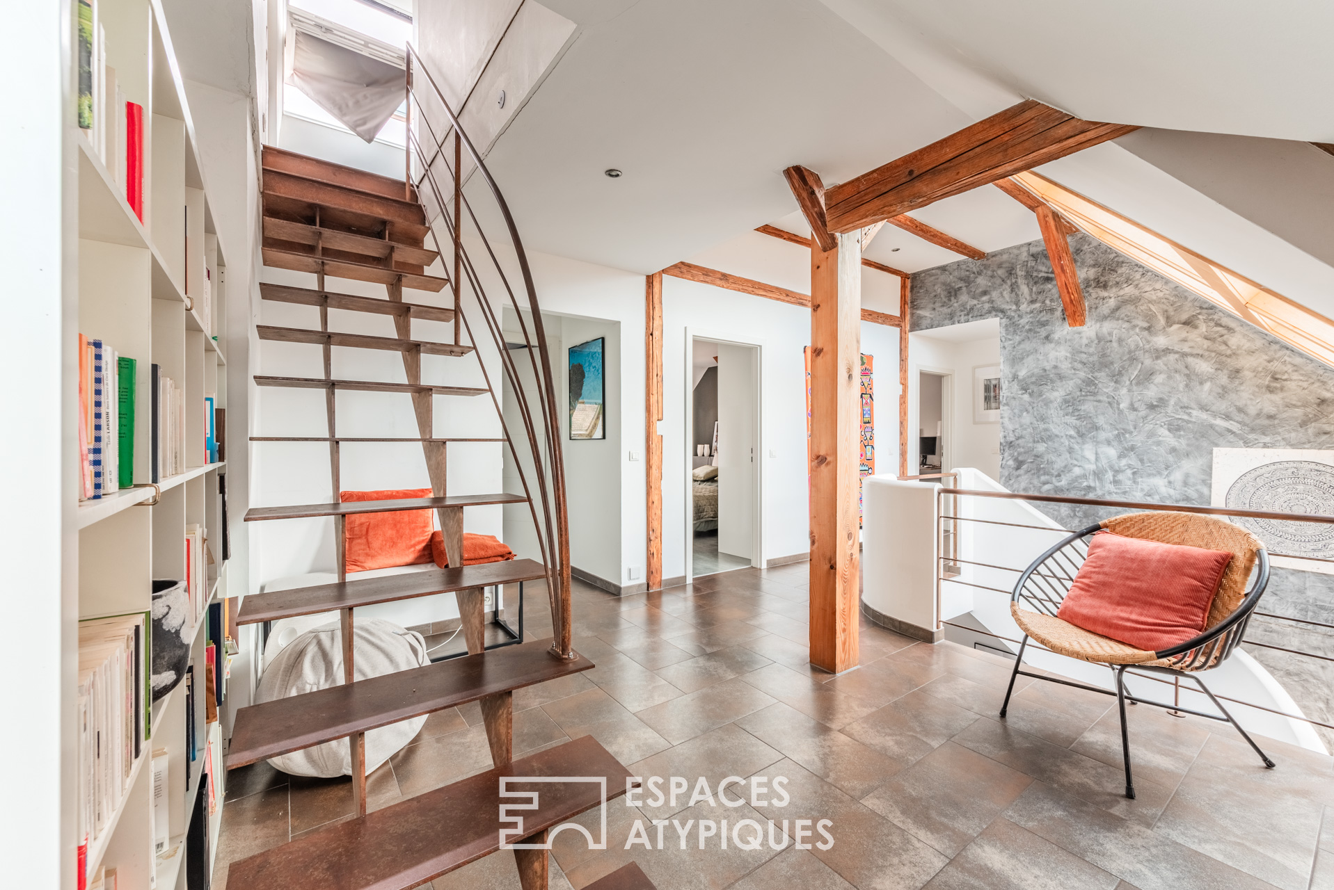 Bathed in light thanks to numerous windows, the mezzanine offers a warm atmosphere with a reading area opening onto the living room below. It leads to two bedrooms, one with a balcony and en suite bathroom, and a study. Served by an aerial steel staircase, an air-conditioned room tucked away under the roof could easily be converted into additional sleeping accommodation or a games room.