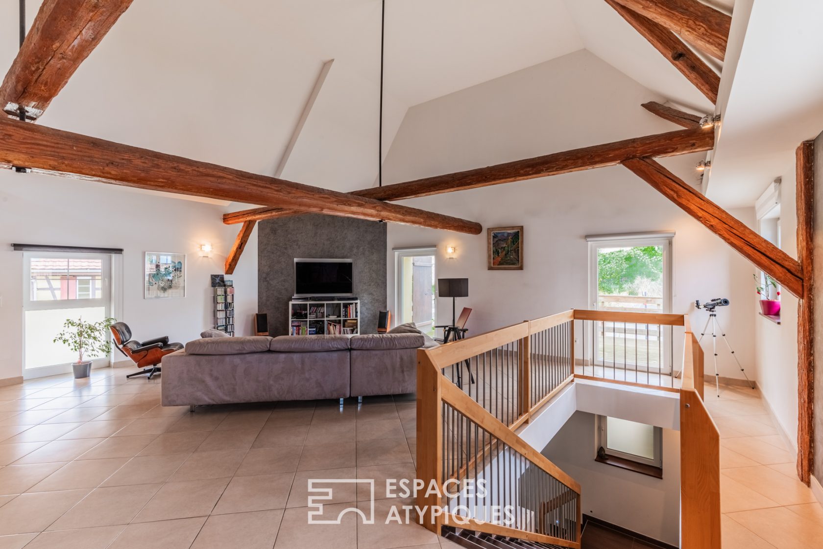 Located 5 minutes from Truchtersheim, this 207 m2 (221 m2 floor area) loft is housed in a former farmhouse that was converted into a condominium in 2009. Boasting a private garden of 200 m2 and two terraces, it boasts extraordinary volumes.