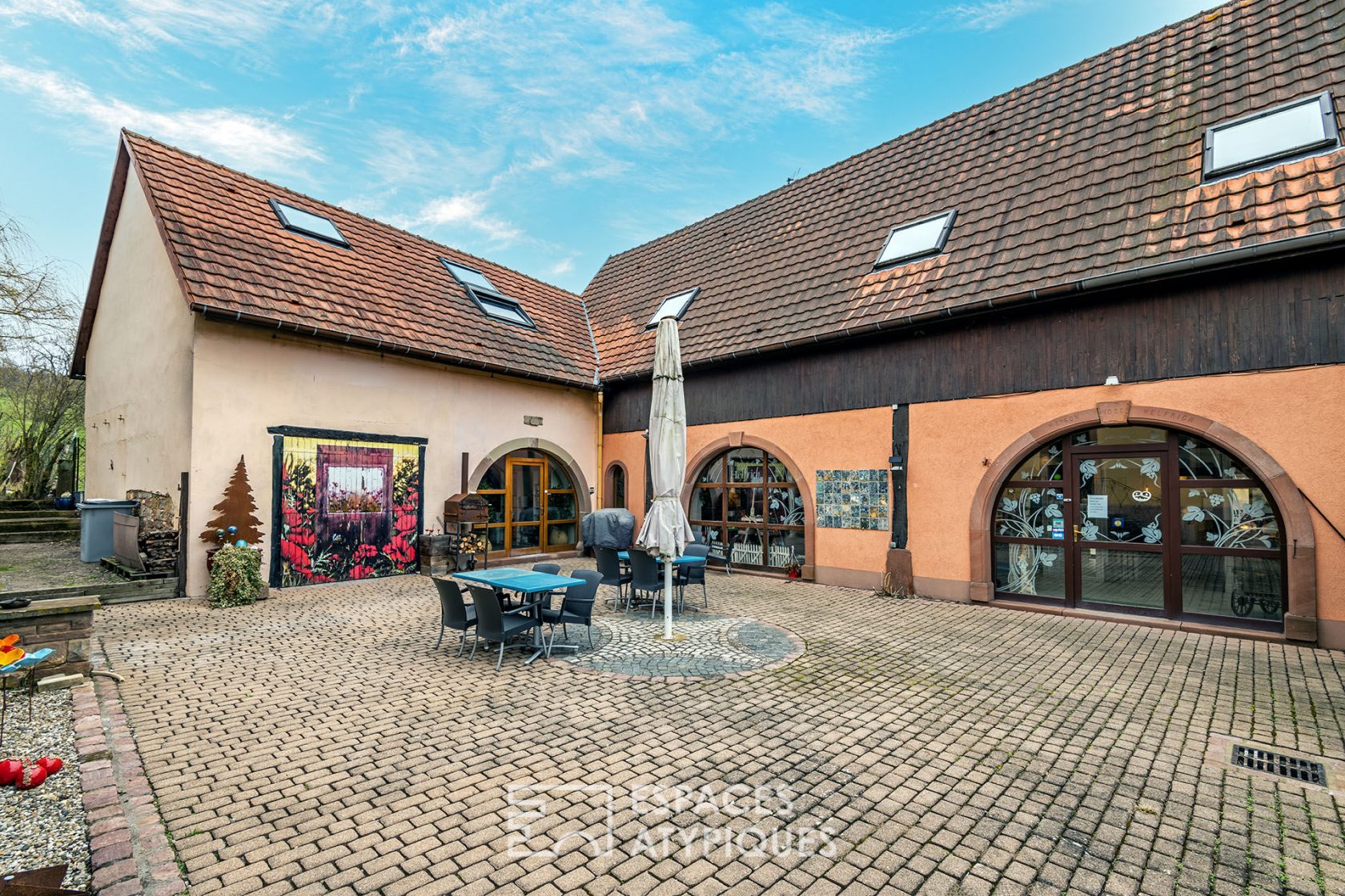 Located in the heart of the Northern Vosges, in a region renowned for its tourist numbers, this old 17th century farmhouse was for many years the village distillery. Its current owners have completely reinterpreted it to create a place to live, a gîte as well as a ceramist’s workshop and a gallery to exhibit their creations, all on a surface of more than 500 m².
