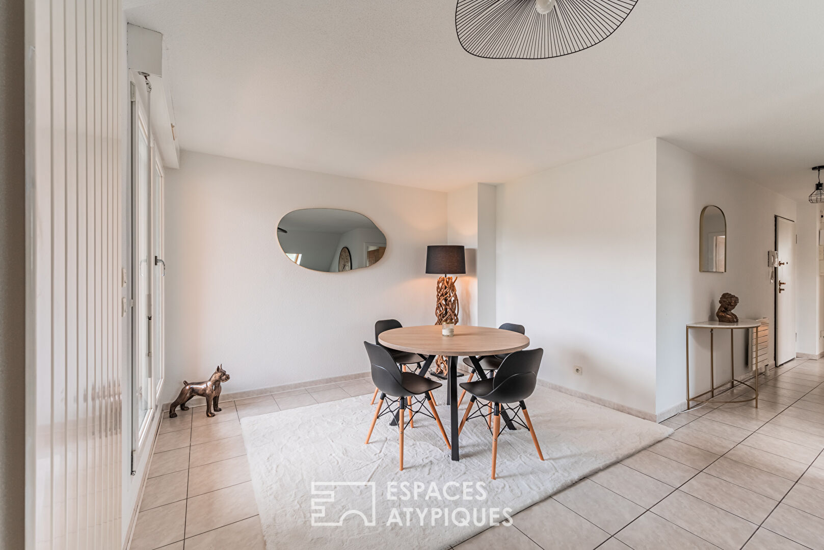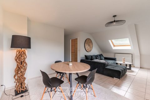 The living room, comprising a lounge and dining area, opens onto the terrace. Sheltered by a wood-clad archway, the terrace offers a pleasant view of the outside world while being protected from the rain or the heat. The separate kitchen is fully equipped and also offers uninterrupted views. A comfortable bathroom and a bright bedroom make up the night space.