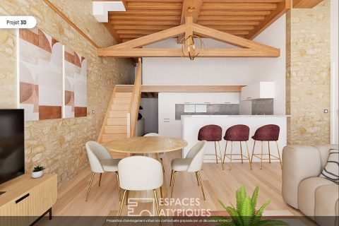 The entrance opens directly onto a large living room lit by two large windows where the exposed stones and the French ceiling recall all the authenticity of this property.