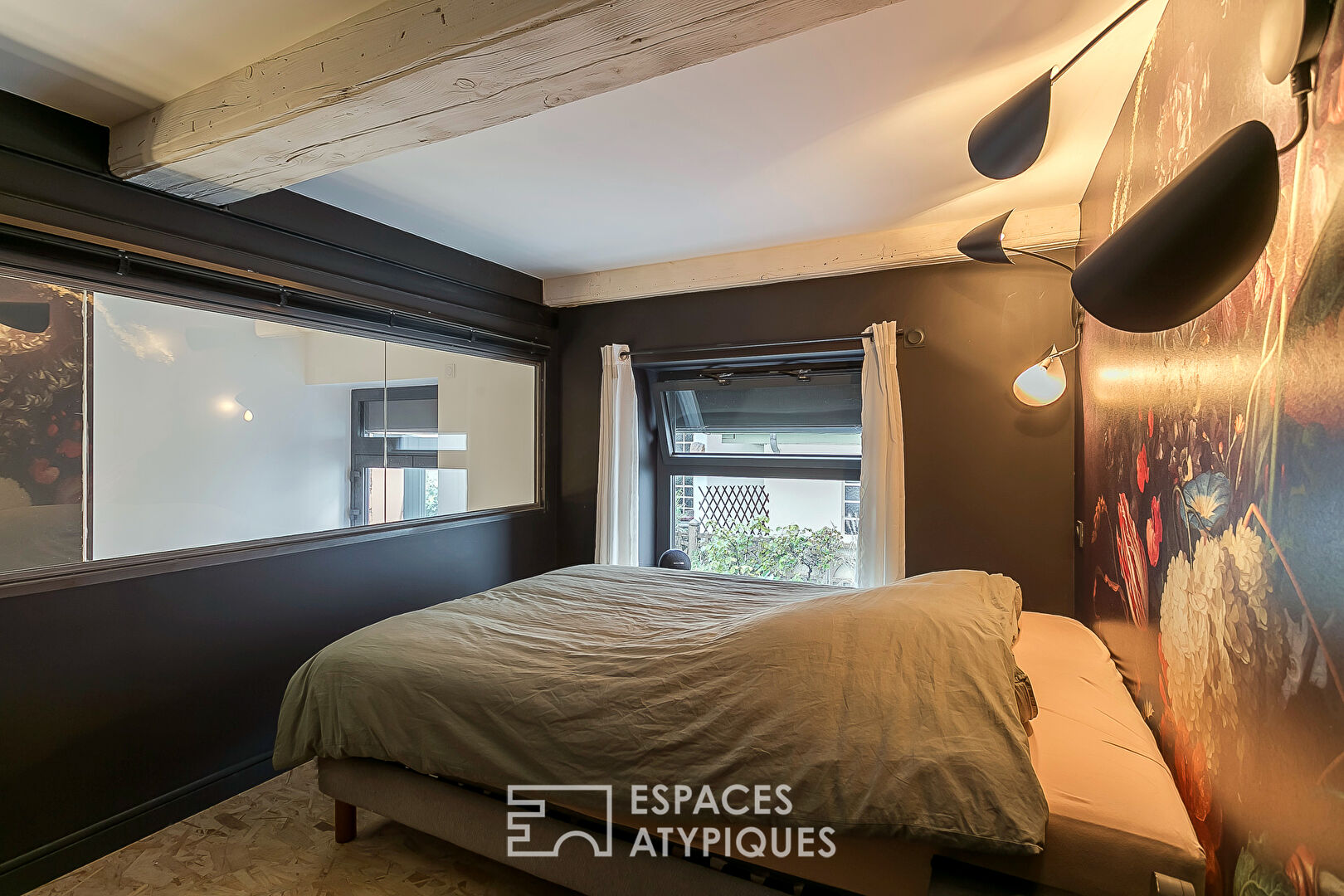 The workshop windows and polished concrete blend perfectly with the original stones and the French ceiling. A first space accommodates a bedroom, an office and a bathroom.