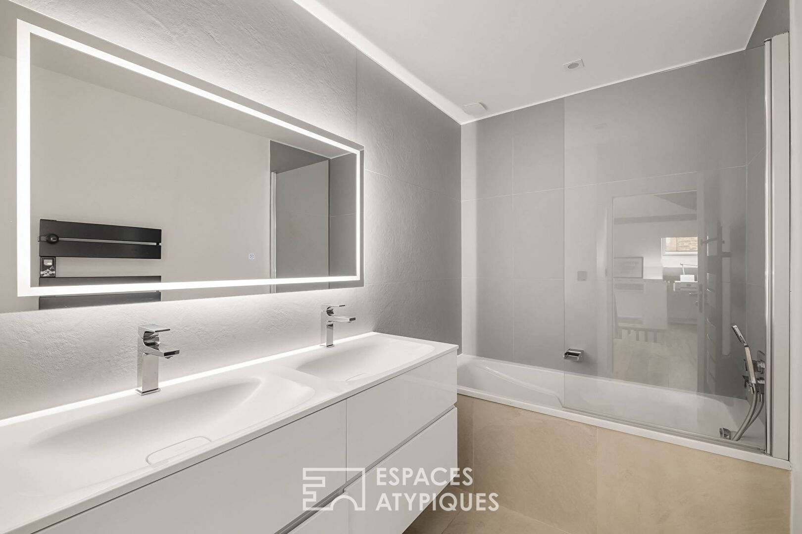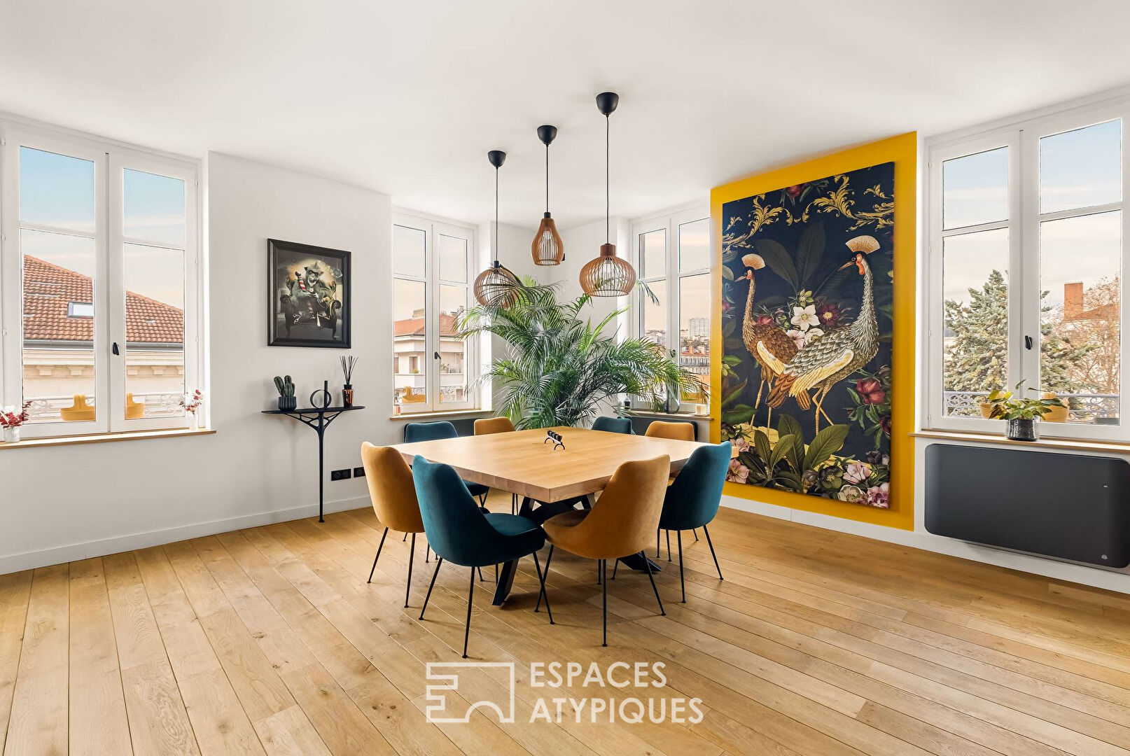 Located in the heart of the highly sought-after Foch district, within a perfectly maintained period building, this top-floor duplex offers approximately 177 sq m (117 sq m living space) of contemporary elegance and old-world charm. Completely redesigned by an architect, it provides a rare living environment where spaciousness, fine materials, and natural light combine to create a decidedly refined atmosphere. Upon entering, the main level opens onto a vast, light-filled living area with six windows, enhanced by a bespoke renovation that blends clean lines, solid wood, and concealed technical elements. The open-plan kitchen, designed as a true convivial space, integrates seamlessly into the overall design. The contemporary staircase leads to the well-laid-out sleeping area. The duplex features four bedrooms, including a generously sized master suite with a private bathroom, as well as an office space ideal for remote work or creative pursuits. Each room benefits from a unique atmosphere, crafted with meticulous attention to detail in the finishes. Absolute tranquility, unobstructed rooftop views, and high-end amenities–air conditioning, built-in storage, a fireplace, and optimized acoustics–complete this exceptional apartment in one of Lyon’s most sought-after areas. A rare address where the authenticity of the original building meets the elegance of a contemporary renovation.