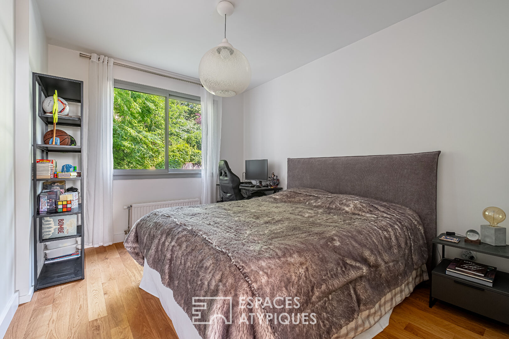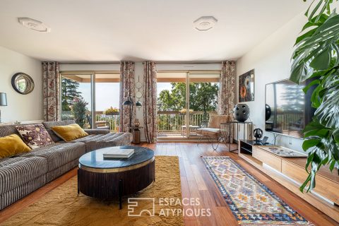 This beautiful 109m2 apartment with high-end services is located in a quiet area, on the hillside. A 5-minute walk from the village of Sainte-Foy-lès-Lyon, this spacious T4 with 2 bedrooms (possible 3) overlooks the south of Lyon and the greenery of the condominium park.