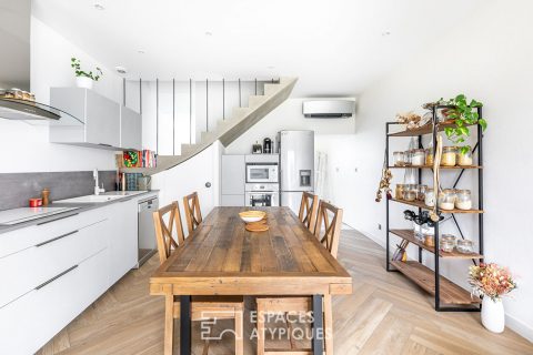 Located in the town of Marcilly-d’Azergues, this duplex apartment, renovated with quality and taste on a living area of 85 sqm, takes place in an old barn divided into 4 lots.