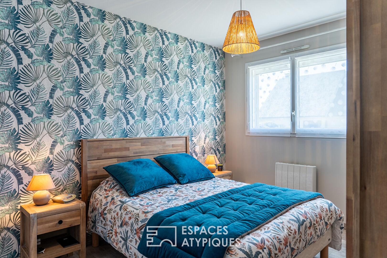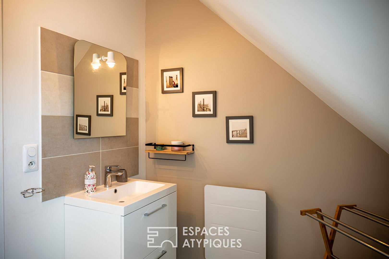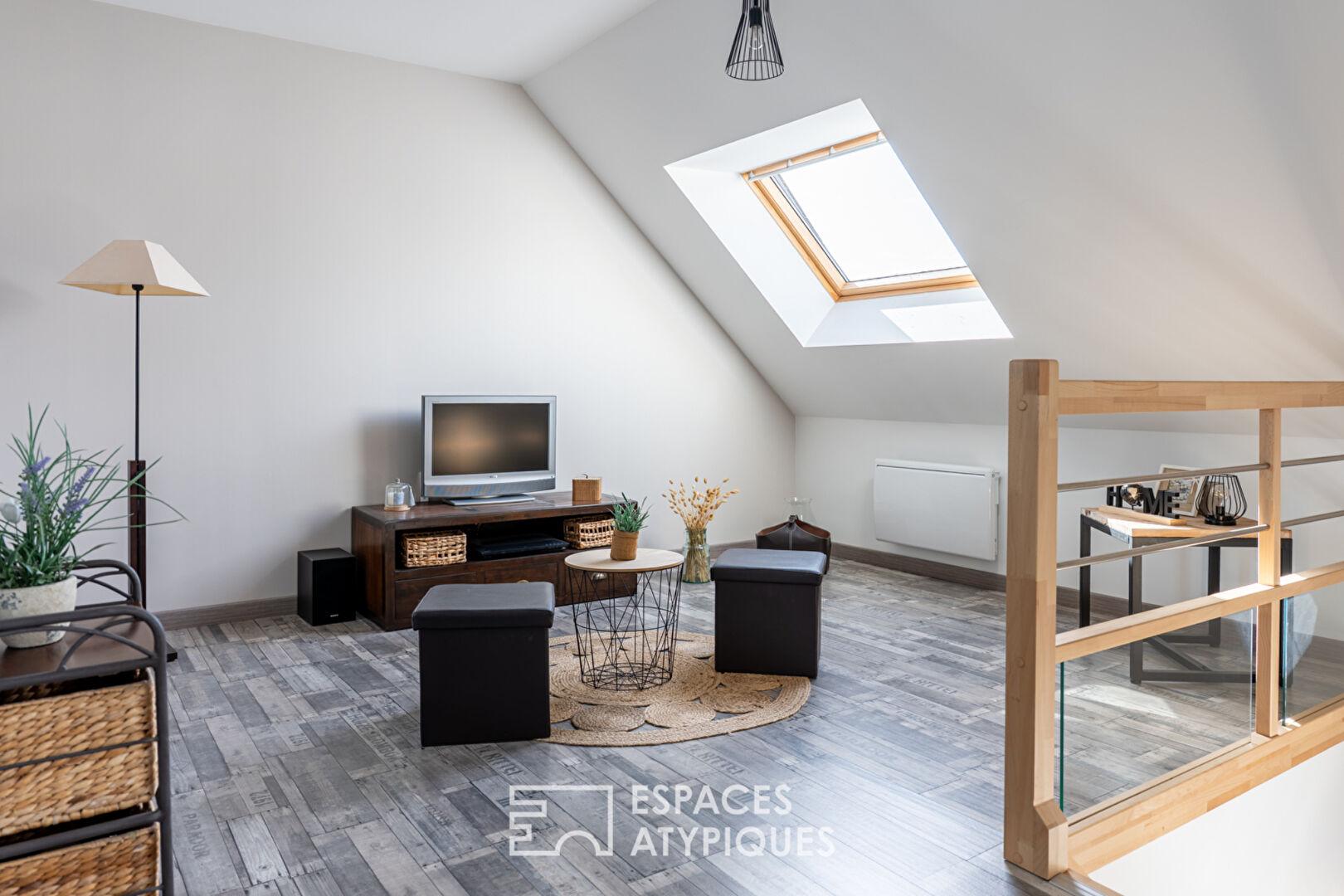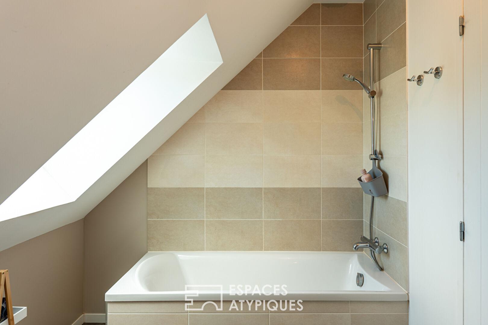 Upstairs, the sleeping area comprises two additional bedrooms, a bathroom with a bathtub, and a separate toilet. A large open-plan mezzanine completes this level. Bathed in light thanks to its skylight, it offers numerous layout possibilities: TV lounge, office, playroom, or reading nook. It adds another dimension to the house, reinforcing its adaptable nature.